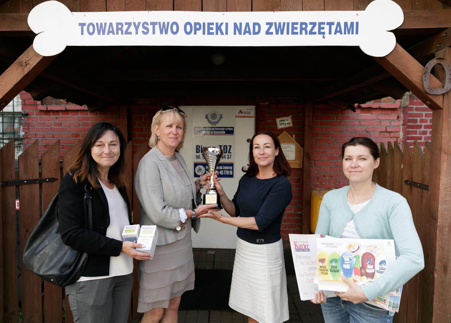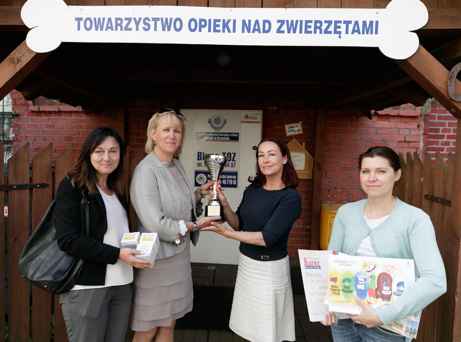 Dorota Laskowska w imieniu zwycięskich uczniów Gimnazjum nr 9 przyjmuje Puchar Przyjaciela Zwierząt, ufundowany przez „Kurier Szczeciński", od prezes szczecińskiego oddziału Towarzystwa Opieki nad Zwierzętami - Renaty Chełmowskiej i Anny Machiny (pierwsza z prawej) z TOZ. To honorowy laur „Maratonu Makulaturowego - zamieniamy papier na leki", którego współorganizatorem jest Remondis - przedstawicielka Maria Szewczyk (na zdjęciu: pierwsza z lewej).