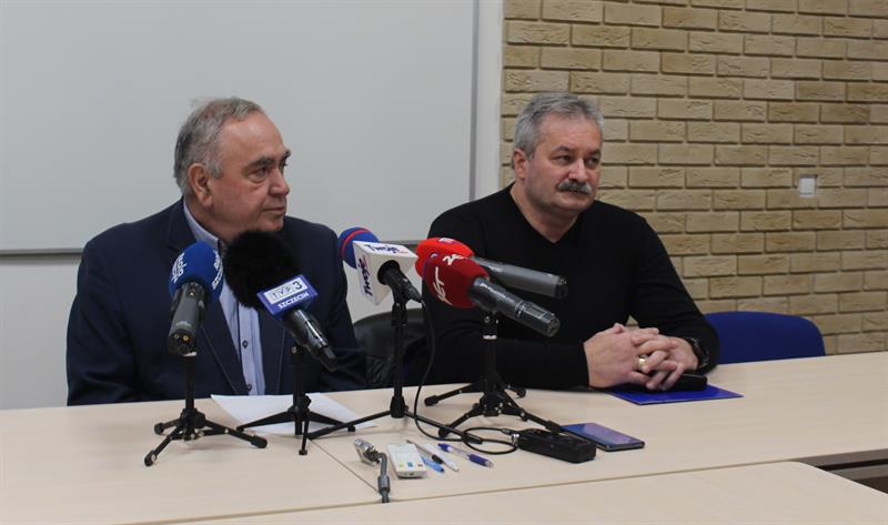 Mieczysław Jurek, przewodniczący ZR Solidarności i Sławomir Sardyko, przewodniczący organizacji związkowych w komunikacji miejskiej zapowiadają pikietę