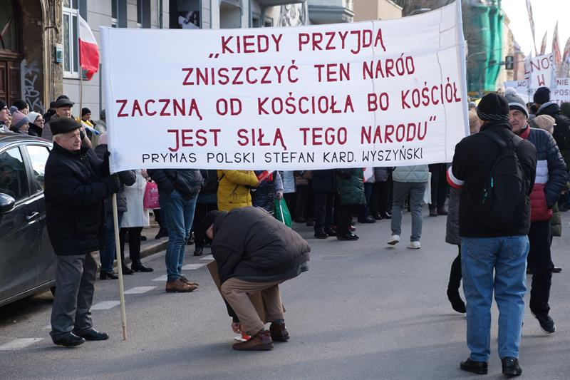 Podczas marszu niesiono transparenty. Mogliśmy przeczytać na nich cytaty z Jana Pawła II - na przykład "Bez prawa do życia nie będzie innych praw" czy "Demokracja bez wartości łatwo się przemienia w totalitaryzm". Przywołano także sentencje prymasa ks. Stefana Wyszyńskiego.: "Kiedy przyjdą zniszczyć ten naród, zaczną od Kościoła, bo Kościół jest siłą tego narodu".