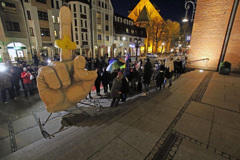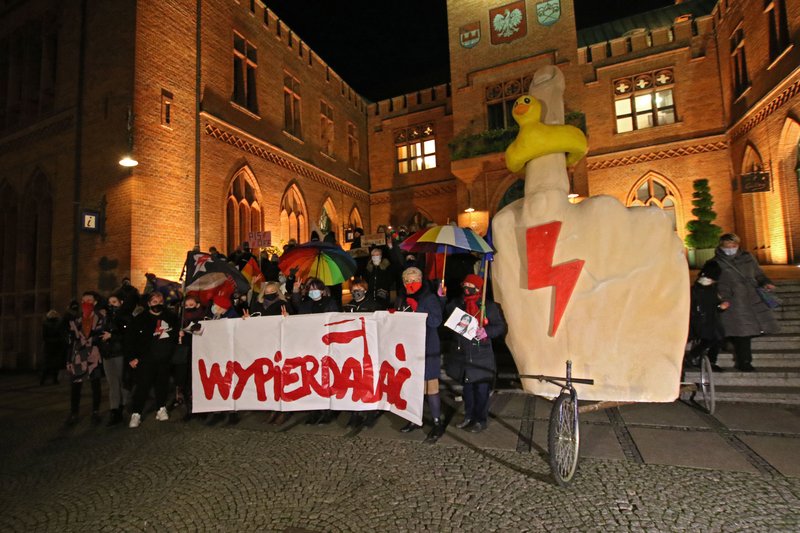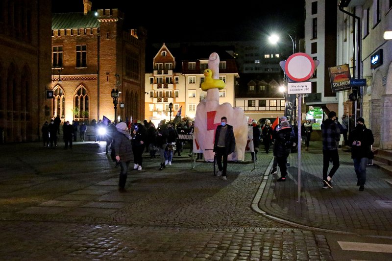 Małe zainteresowanie akcją tłumaczyli obawami potencjalnych uczestników przed konsekwencjami, np. służbowymi. Tak, czy inaczej - trzeba przyznać, że ci, którzy przyszli pod kołobrzeski Ratusz Miejski, skąd wystartował marsz, solidnie przygotowali się do demonstracji. Na jej czele jechała dużych rozmiarów instalacja, przestawiająca dłoń z wyciągniętym do góry środkowym palcem, na którym zamocowana była figurka dmuchanej kaczuszki. Były też transparenty, wielokolorowe oraz czarne parasolki, a także flagi.