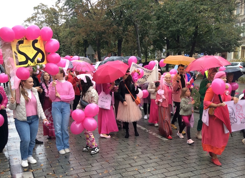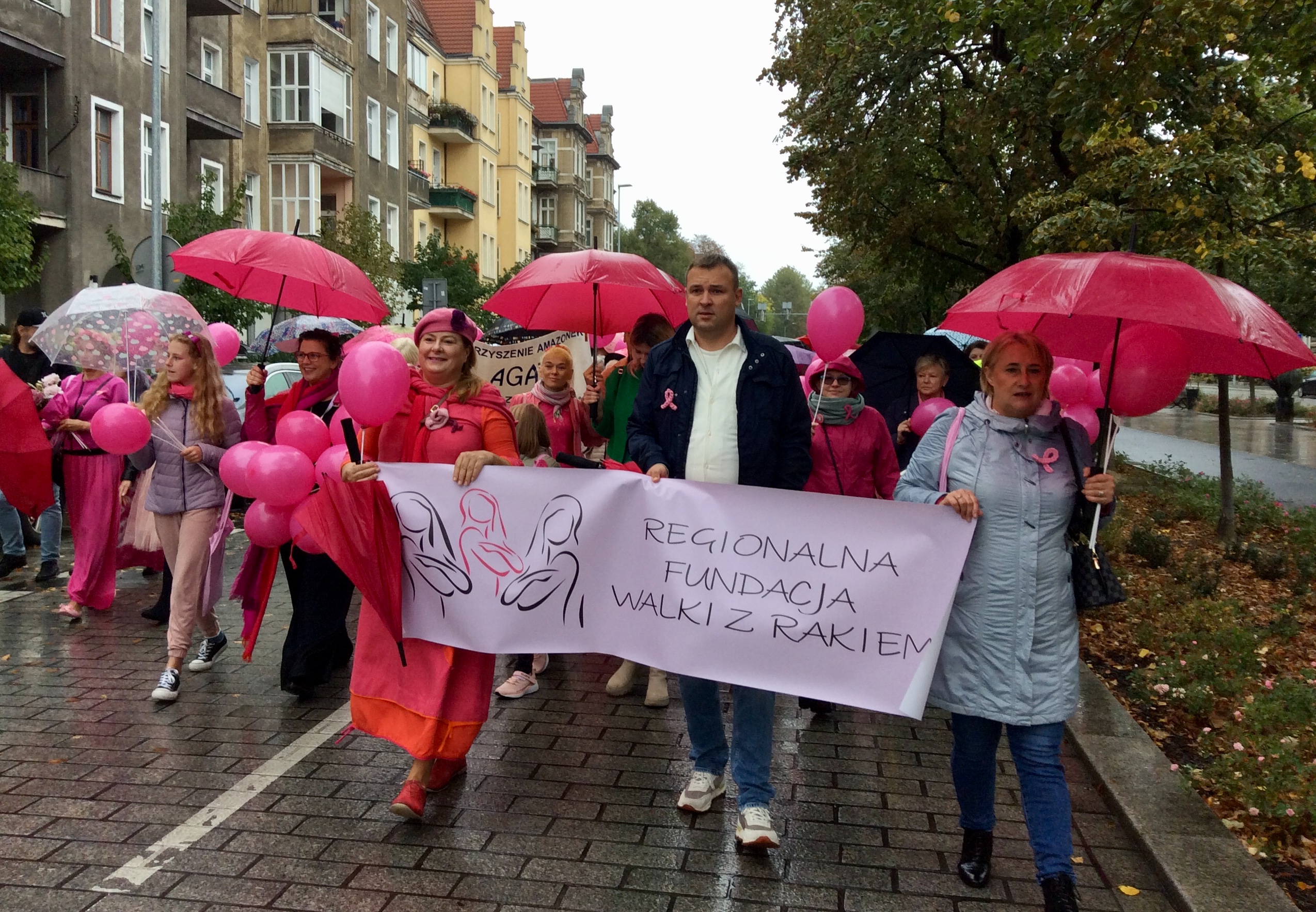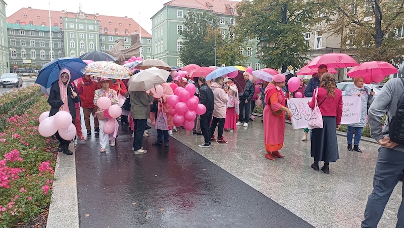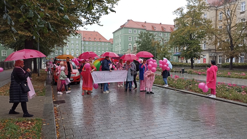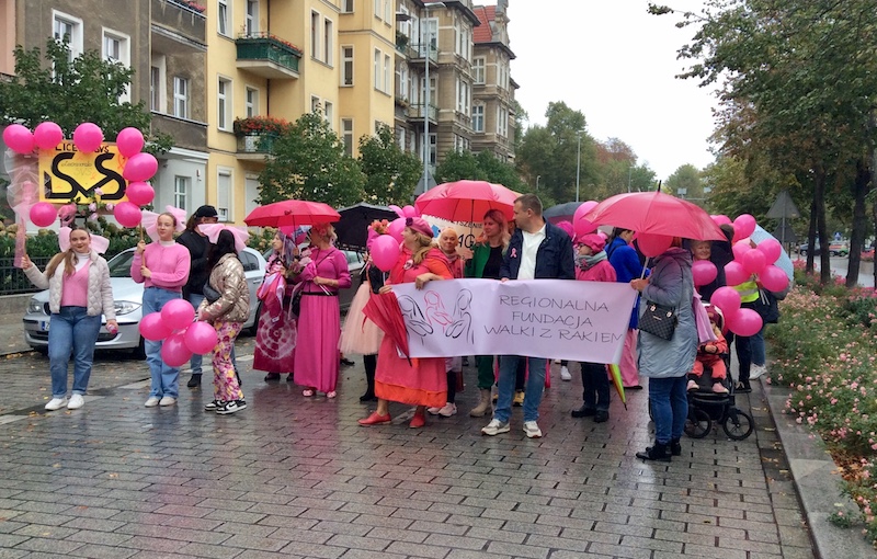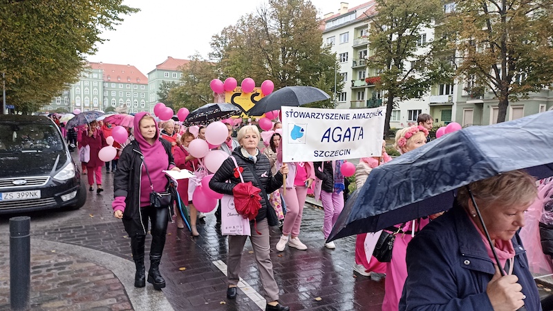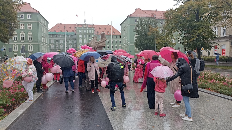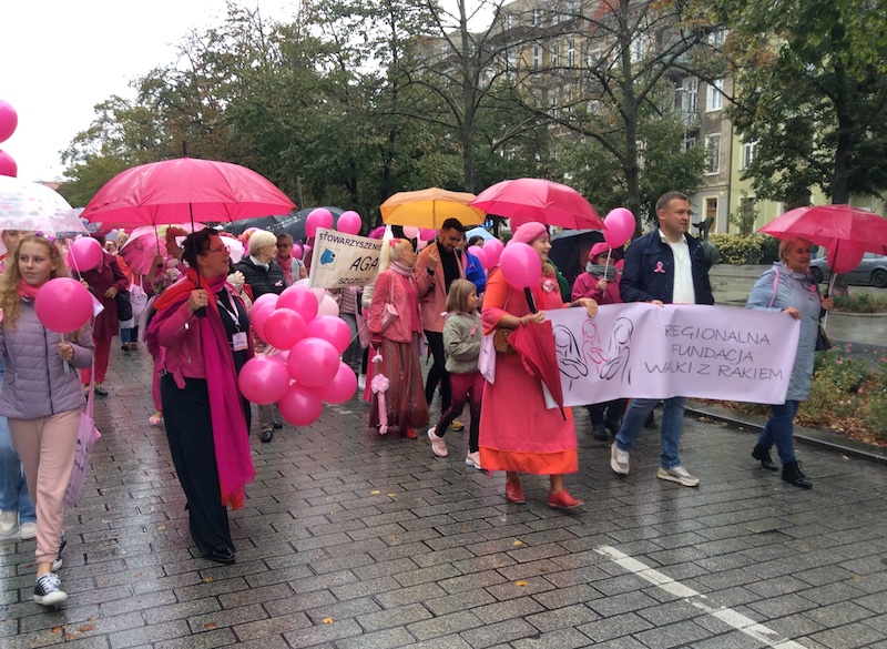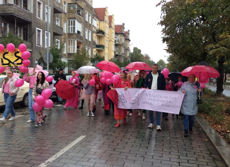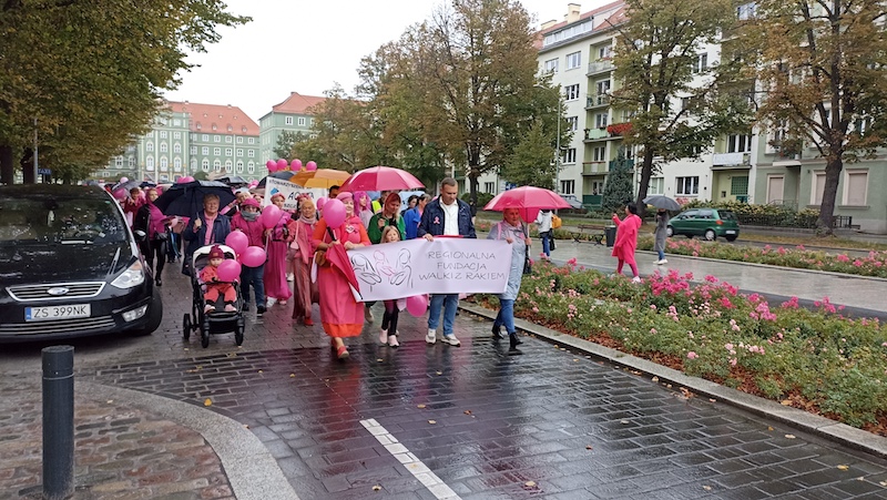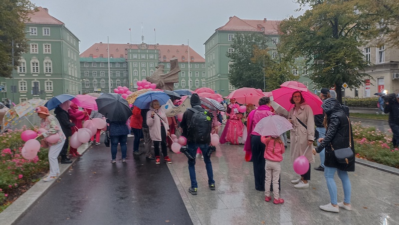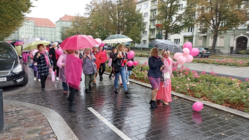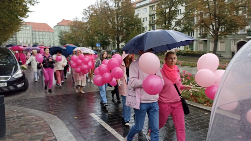 Tuż po tym, jak w sobotnie południe przebrzmiał hejnał ze szczecińskiego Urzędu Miasta, przed jego gmachem rozpoczął się Marsz Różowej Wstążki. Być może z powodu deszczowej pogody frekwencja była mniejsza, niż w ubiegłych latach, ale uczestniczki ( i uczestnicy) nie zawiedli. W ich strojach dominował oczywiście kolor różowy, dodatkowo otrzymywali wstążki i baloniki w tych samych barwach. Marsz zakończył się w gmachu szczecińskiej filharmonii.