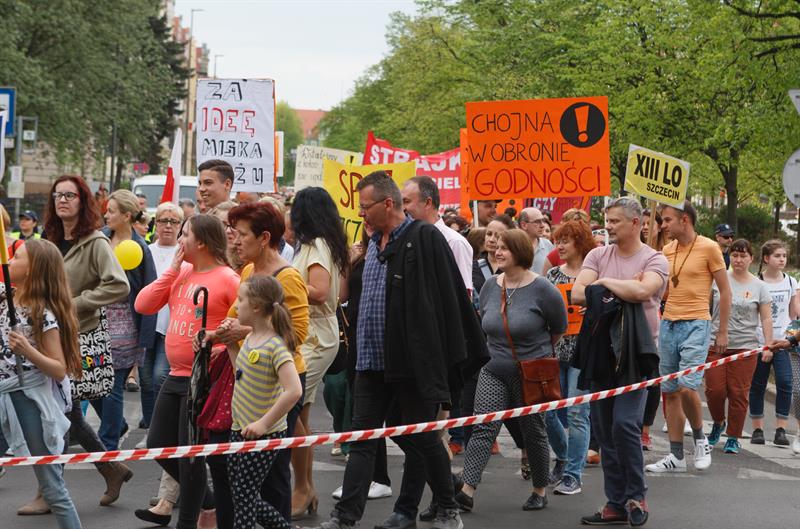 Marsz i manifestacja zgromadziły setki nauczycieli i osób wspierających ich protest w piątkowy (26 kwietnia) wieczór w Szczecinie. Przeszli oni od budynku Urzędu Miejskiego przez centrum miasta na plac Solidarności. - W jedności siła - padało wielokrotnie