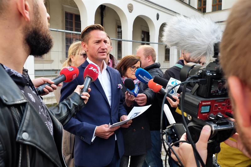 Na zdjęciu: Olgierd Geblewicz, marszałek województwa, zwołał w srodę na dziedzińcu głównym zamku briefing. Ustosunkował się do ekspertyzy rzeczoznawców ustalających przyczyny katastrofy budowlanej.