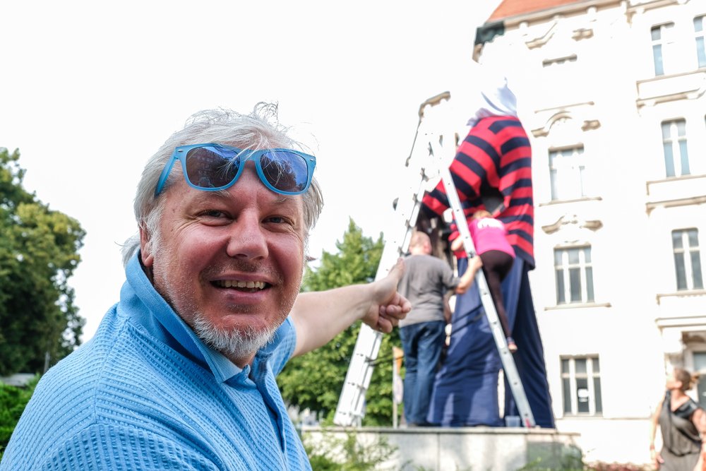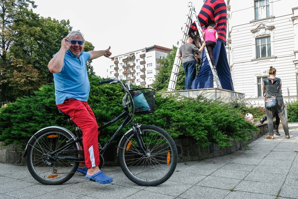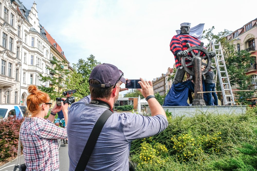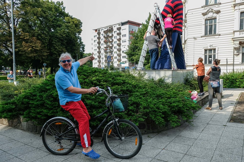 Zakładanie nowego stroju marynarzowi wzbudzało zainteresowanie przechodniów oraz osób przejeżdżających w pobliżu samochodami czy rowerami. Wśród nich spotkaliśmy m.in. znanego szczecińskiego aktora Michała Janickiego, któremu spodobał się nowy wizerunek rzeźby.