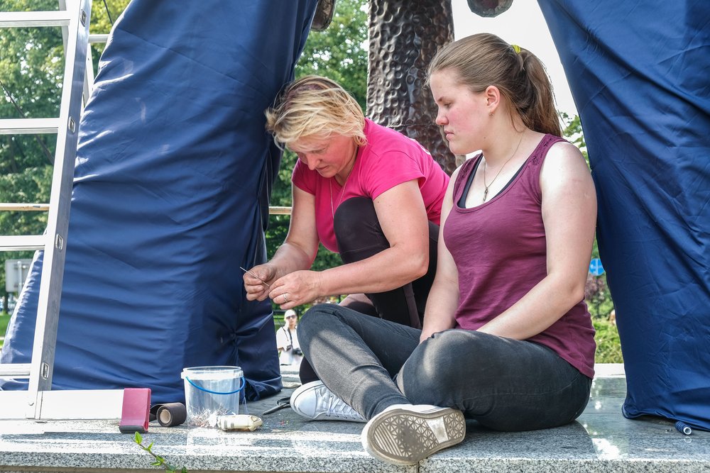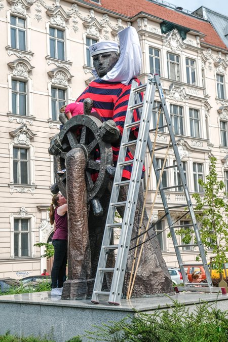 Marynarza przyodziała w czwartek (20 lipca) po południu czteroosobowa ekipa. Pracami kierowała Agnieszka Kujda-Jakacka, która również wykonała strój (podobnie jak w latach 2013 i 2015). Zakładaniem i mocowaniem bluzy, spodni, czapki, kołnierza oraz krawata zajęli się mąż, córka i siostra pani Agnieszki. Potrzebna była drabina, specjalne tyczki, mnóstwo szpilek i szewskie nici.