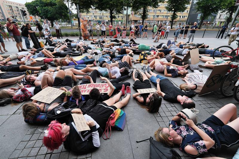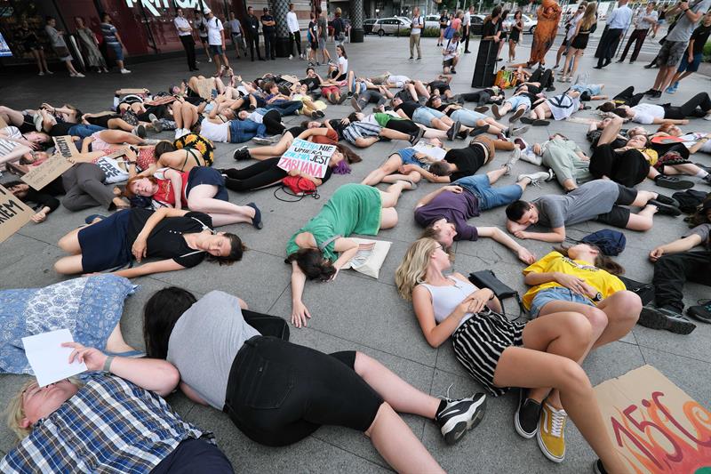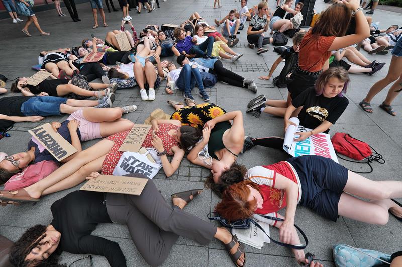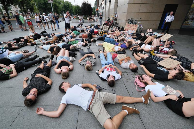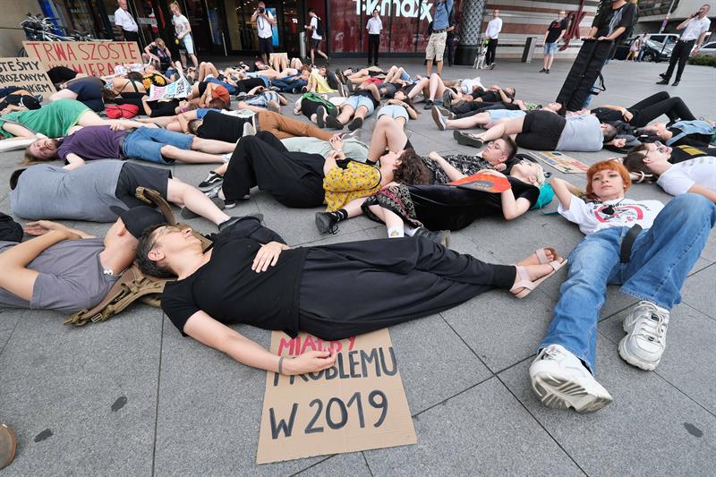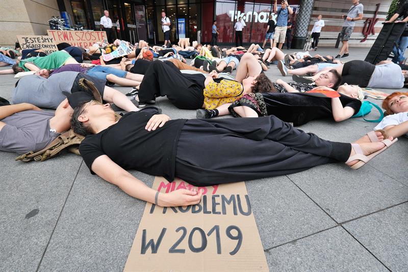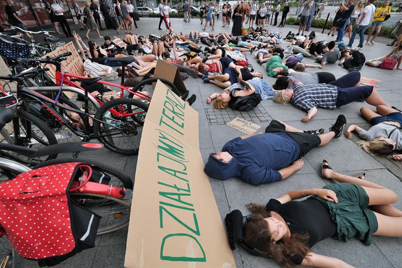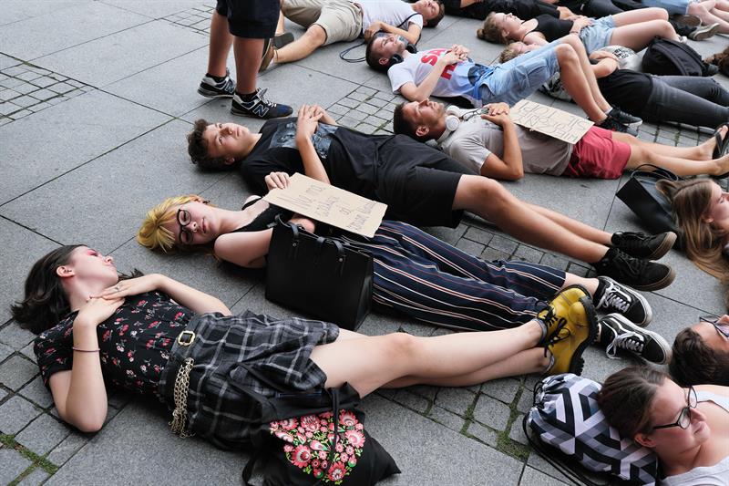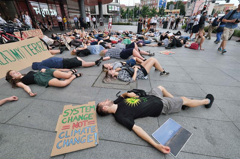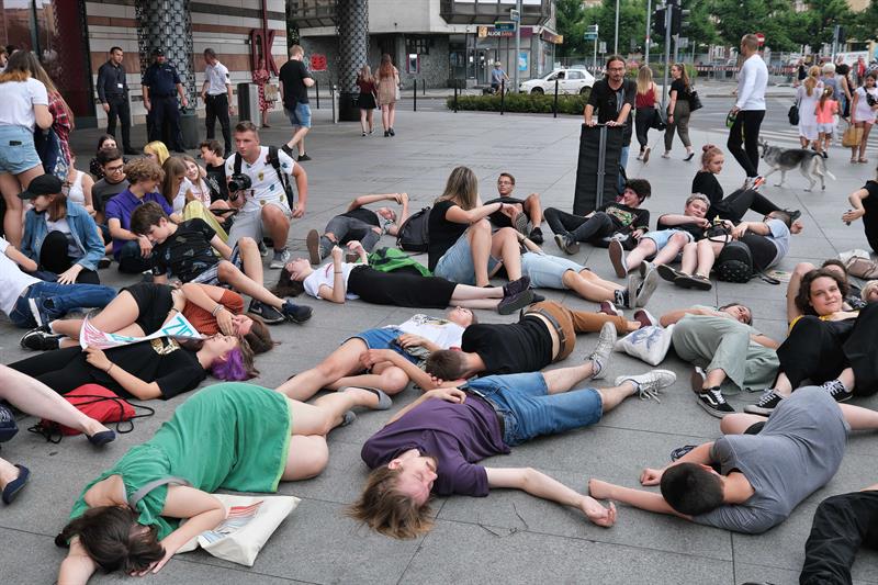 Na zgromadzenie przyszło kilkadziesiąt osób, głównie młodych. Trzymali transparenty z różnymi hasłami - zarówno żartobliwymi, jak i poważnymi. Jedno z nich głosiło, że "Ziemia nie umiera - Ziemia jest zabijana" a jedna z leżących trzymała napis "sąsiad zabił mnie za szklankę wody", co miało być odwołaniem do społecznych skutków zmian klimatu - według naukowców niedobory wody będą prowadzić do masowych migracji i zażartych konfliktów o tereny, gdzie jeszcze będą panować warunki do życia.