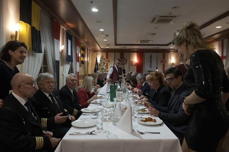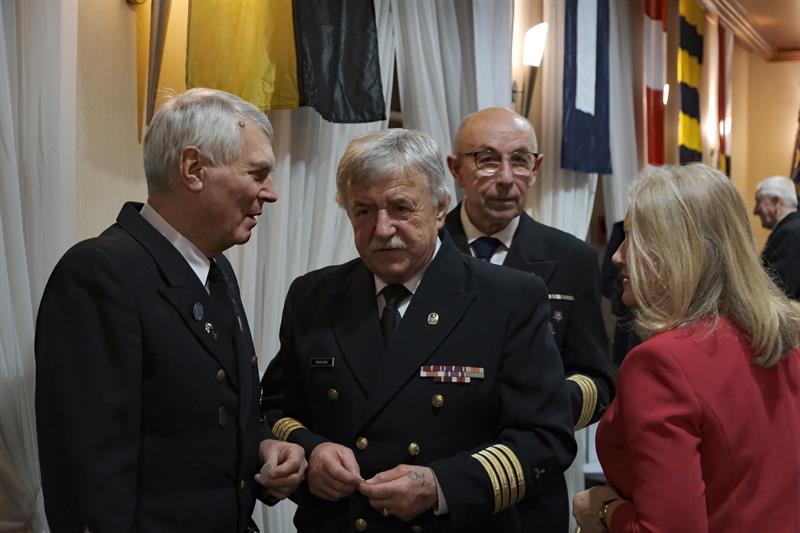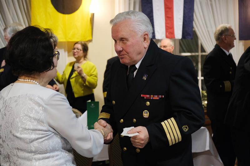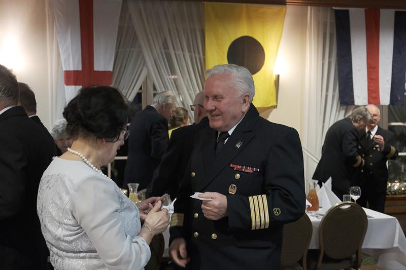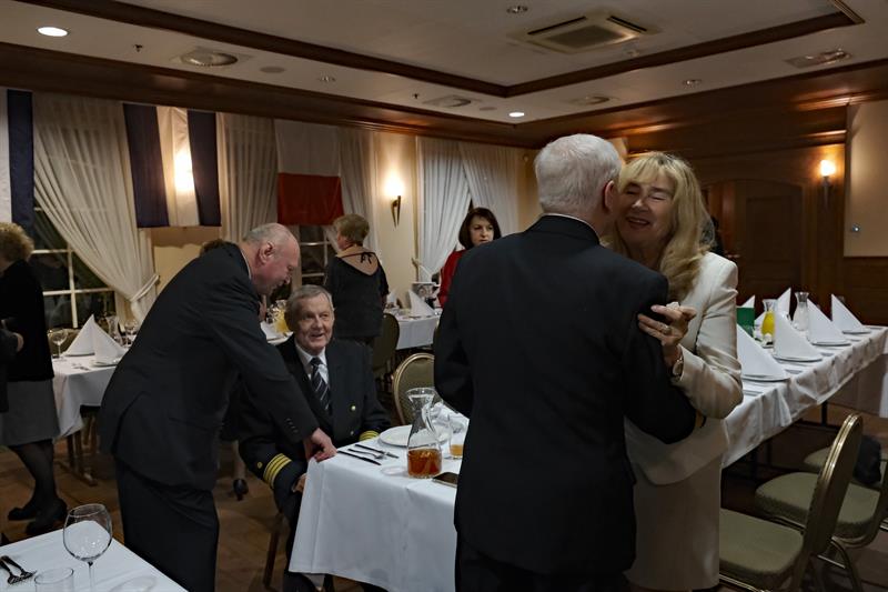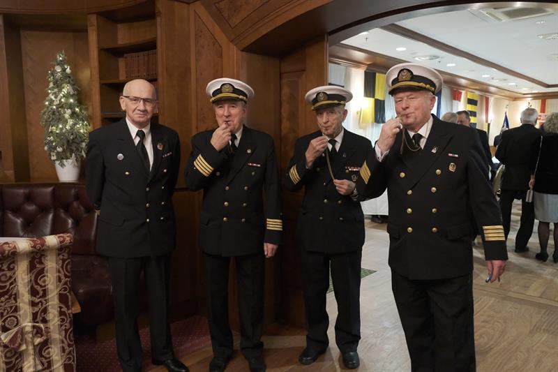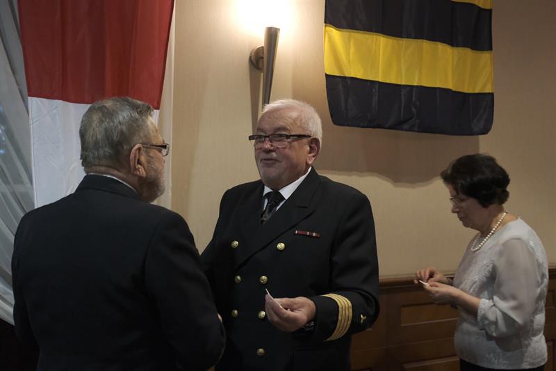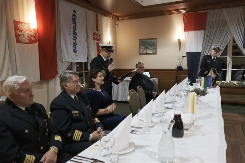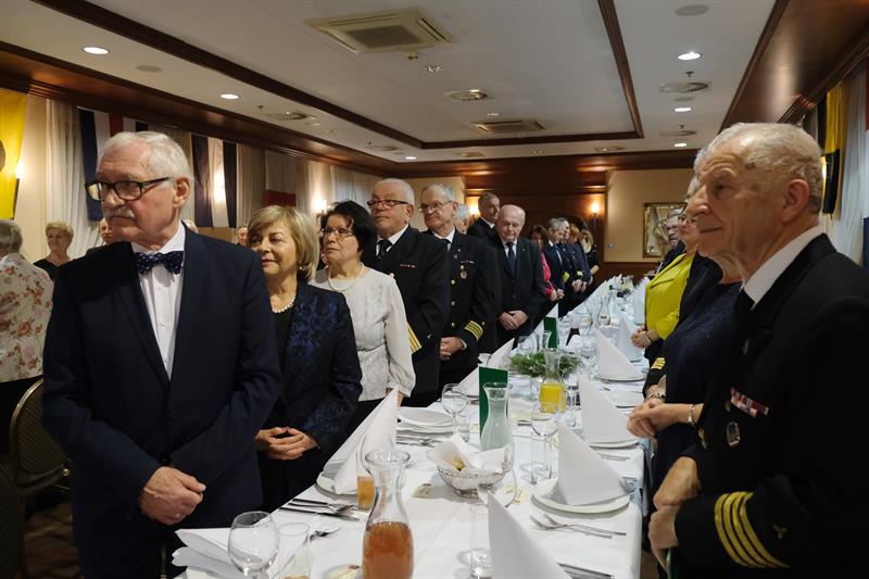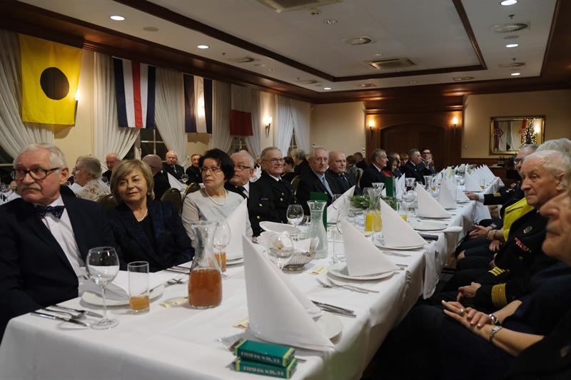 Dodajmy, że organizatorzy zadbali o morski wystrój sali, w której się odbyło spotkanie. Na ścianach zawieszono flagi kodu sygnałowego, polską banderę oraz flagi armatorów, takich jak Polska Żegluga Morska, Euroafrica, PLO i POL-Levant. Nie zabrakło sztandaru SSOMM.