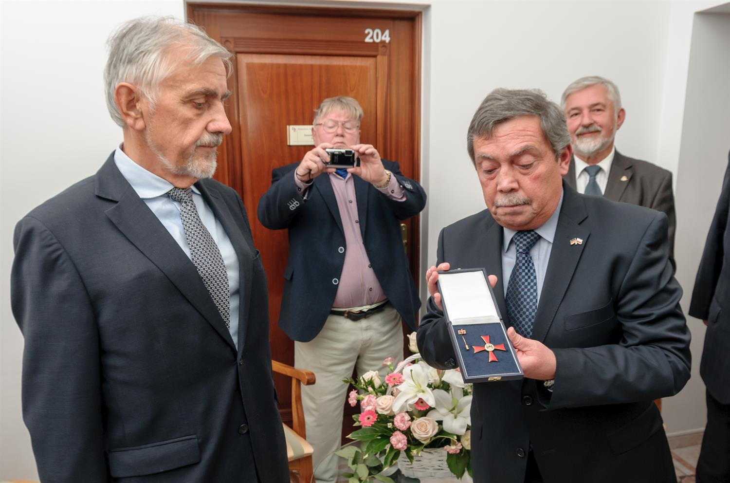 Na zdjęciu od lewej: Krzyż Zasługi Republiki Federalnej Niemiec Markowi Tałasiewiczowi przekazał Bartłomiej Sochański.