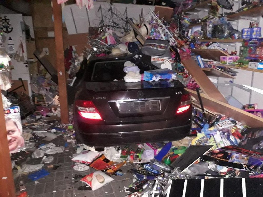 Jak widać na zdjęciu siła uderzenia była spora, ale jak się okazało kierujący pojazdem był trzeźwy. Zdaniem przybyłych na miejsce ratowników medycznych mężczyzna zasłabł. Ani jemu, ani też czterem pasażerom samochodu nic się nie stało. Policja ukarało kierującego mandatem w wysokości 250 zł. Jak wielkie straty poniósł właściciel sklepu tego nie wiadomo, ale zapewne znacznie większe niż kwota mandatu.