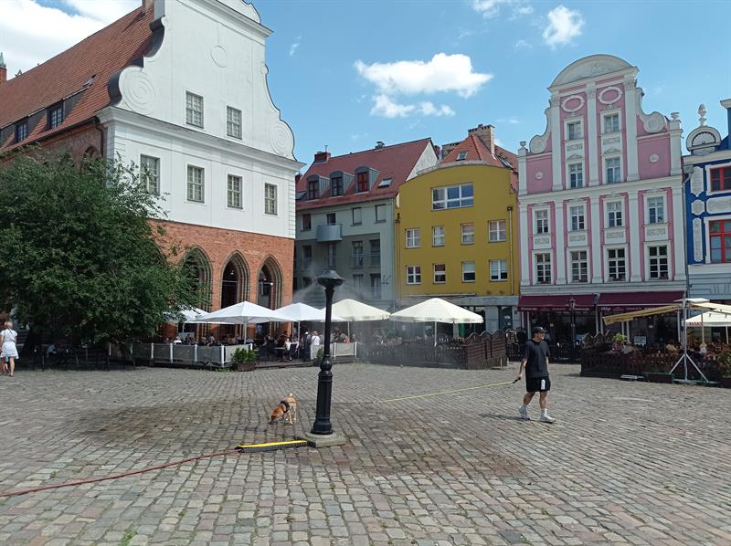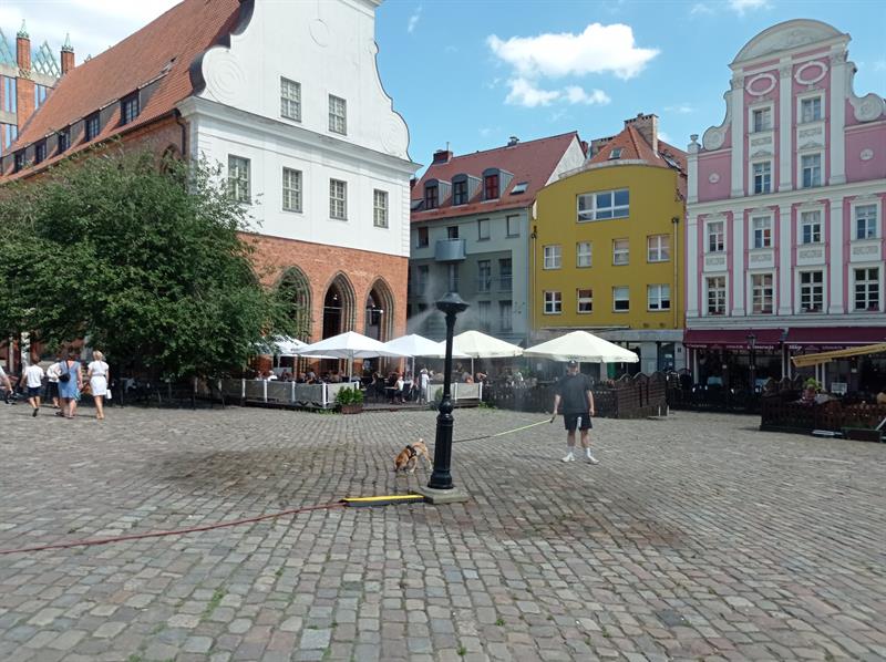 Już nie tylko na pl. Orła Białego, ale również na dolnym tarasie Starego Miasta można skorzystać z wodnej mgiełki. Zraszacz w stylu retro, stylizowany na zabytkową lampę, stanął na Rynku Siennym w Szczecinie.