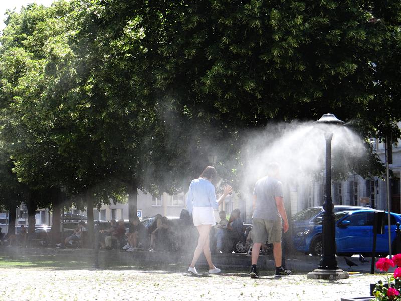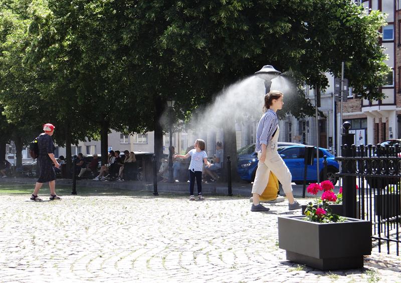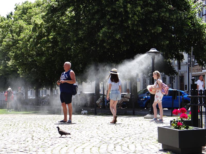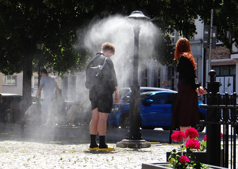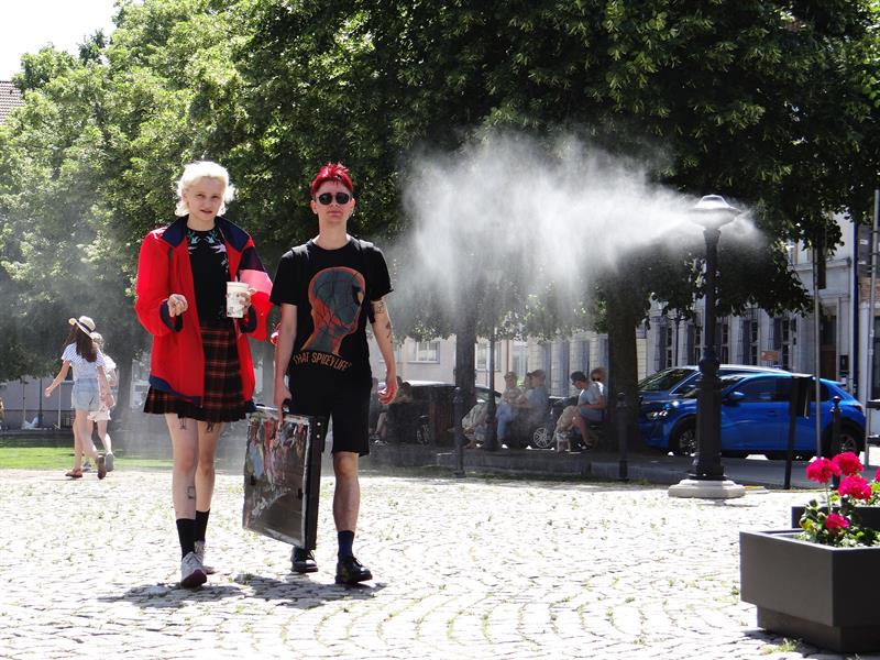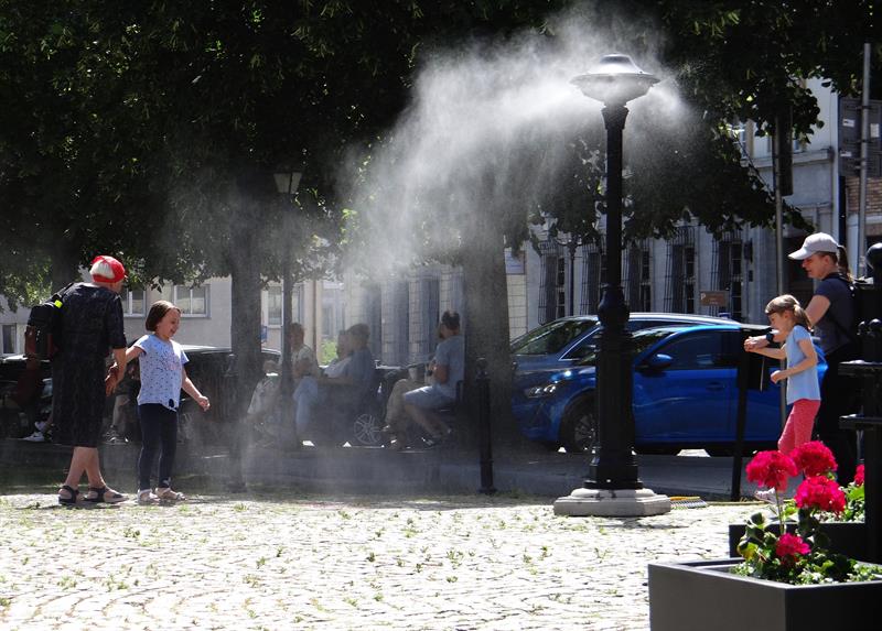 Temperatury szybują w górę, bijąc kolejne rekordy lata. Gdy żar z nieba nie odpuszcza, warto znaleźć miejsce dla ochłody. Choćby na chwilę, w przelocie. Jak na pl. Orła Białego - wejść w strefę wodnej mgiełki, jaka wydobywa się ze zraszacza w stylu retro, przypominającego lampę, jaki został zainstalowany opodal od lat nieczynnej zabytkowej fontanny.