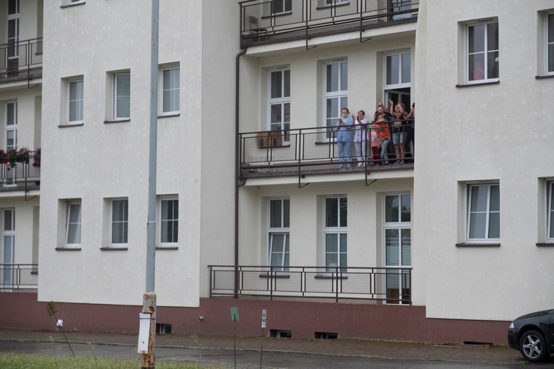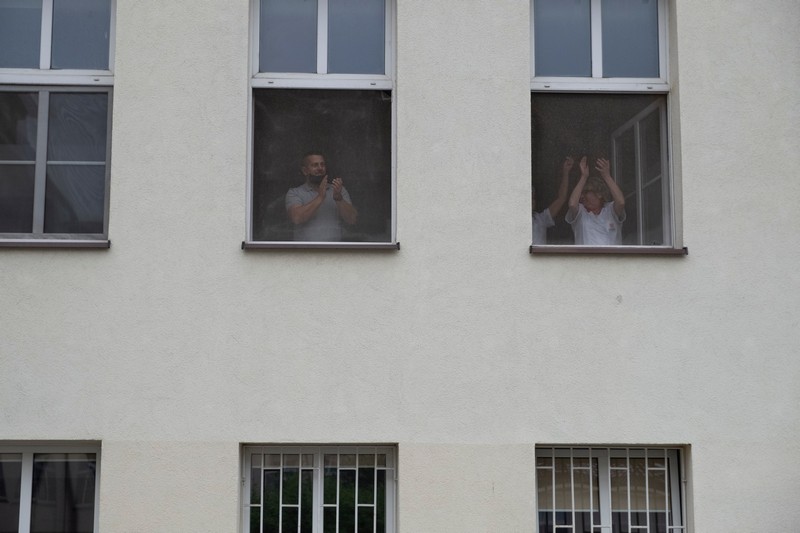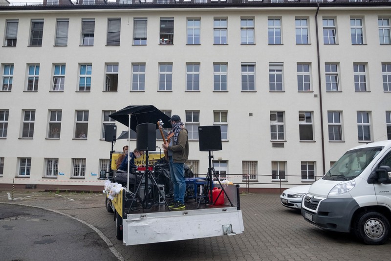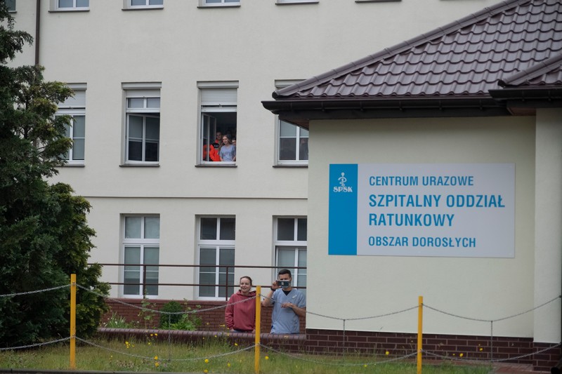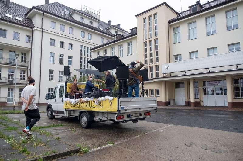 O godz. 14.10 byli już w szpitalu przy ul. Unii Lubelskiej. Tu zagrali minikoncerty na trzech wewnętrznych dziedzińcach. W oknach i na balkonach natychmiast pojawiła się wyjątkowa publiczność: pacjenci w szlafrokach i medycy w fartuchach.
