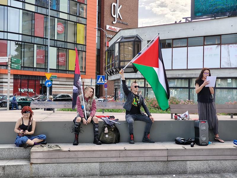 "Przeciwko zbrodniom w Palestynie, w Ukrainie i w każdym zakątku ziemi" protestowali uczestnicy manifestacji na pl. Adamowicza w Szczecinie. Fot. Arleta NALEWAJKO