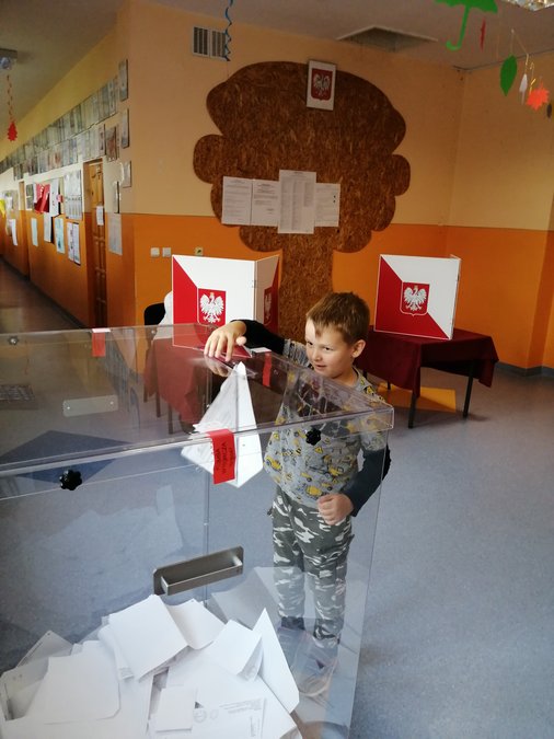 Na zdjęciu: 6-letni Mateusz wrzuca karty do głosowania w Piasku.