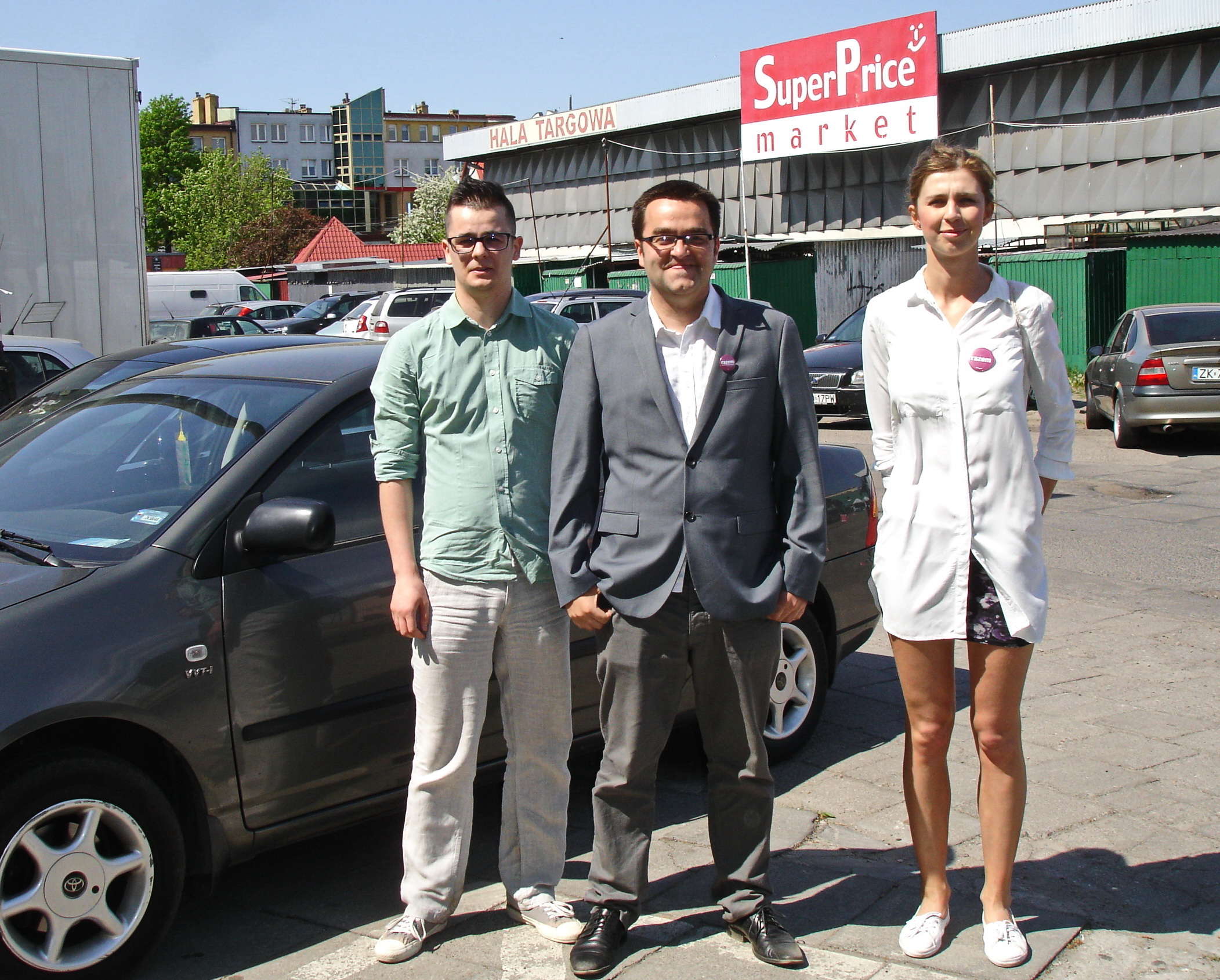 Na zdjęciu: Dawne targowisko „Manhattan” przy ul. Drzymały, które od wielu lat nie znajduje nabywcy. Partia Razem widzi tu przyszłe lokale mieszkalne, lecz zbudowane przez aktywnych koszalinian, a nie dewelopera. Od prawej: Agata Piotrowska, Jacek Wezgraj i Michał Kaczmarek.