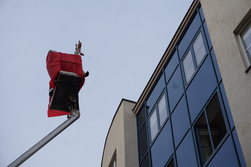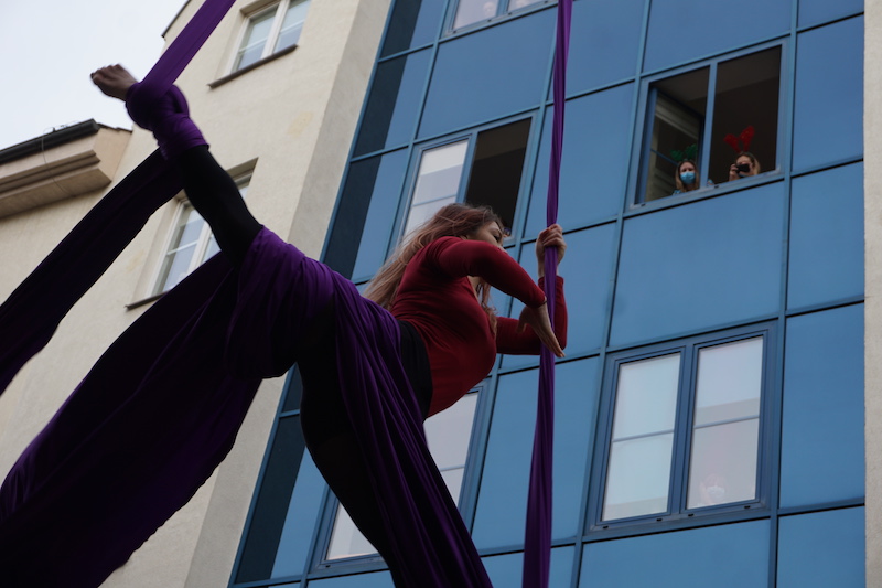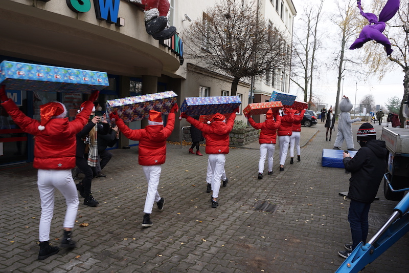 Przed budynkiem były tańce małych pomocników Mikołaja i akrobacje powietrzne. Kunsztem wykazał się operator podnośnika, który świetnie operował w ciasnej przestrzeni tak, aby nic nie stało się Świętemu oraz delikatnej elewacji budynku.