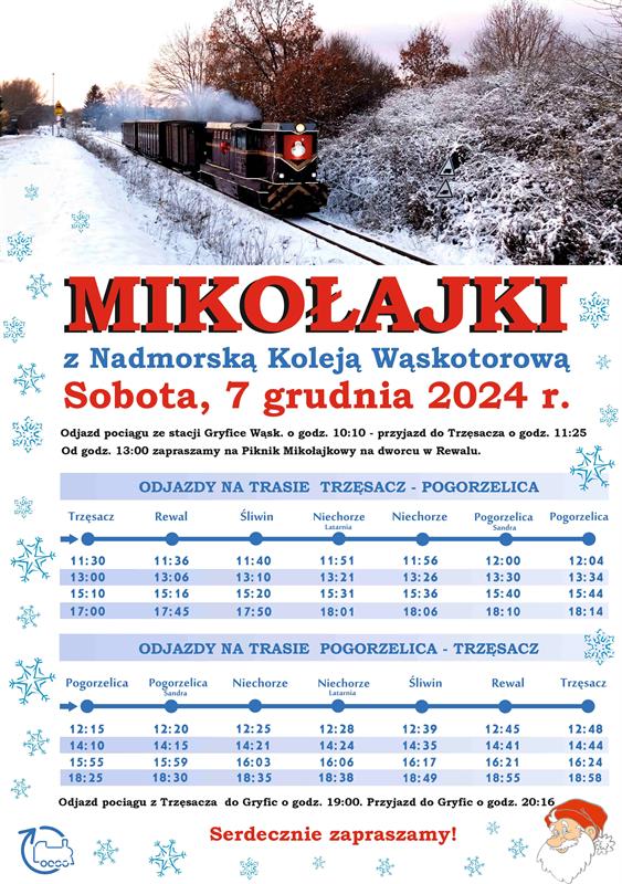 W sobotę, 7 bm., pociągi Nadmorskiej Kolei Wąskotorowej kursować będą według specjalnego rozkładu jazdy. Na piknik mikołajkowy w Rewalu będzie można dotrzeć pierwszym kursem z Gryfic – odjazd ze stacji Gryfice Wąskotorówka o godz. 10.10, a potem już 4 kursami wahadłowymi z poszczególnych stacji, zlokalizowanych na wąskotorowym szlaku Gminy Rewal. Podczas ostatniego kursu z Trzęsacza do Pogorzelicy (odjazd o godz. 17.00) zaplanowany jest 40-minutowy postój pociągu w Rewalu. Po imprezie kolejka rozwiezie uczestników w kierunku Pogorzelicy (odjazd z Rewala o godz. 17.45) i z powrotem do Gryfic (odjazd z Pogorzelicy o godz. 18.25).