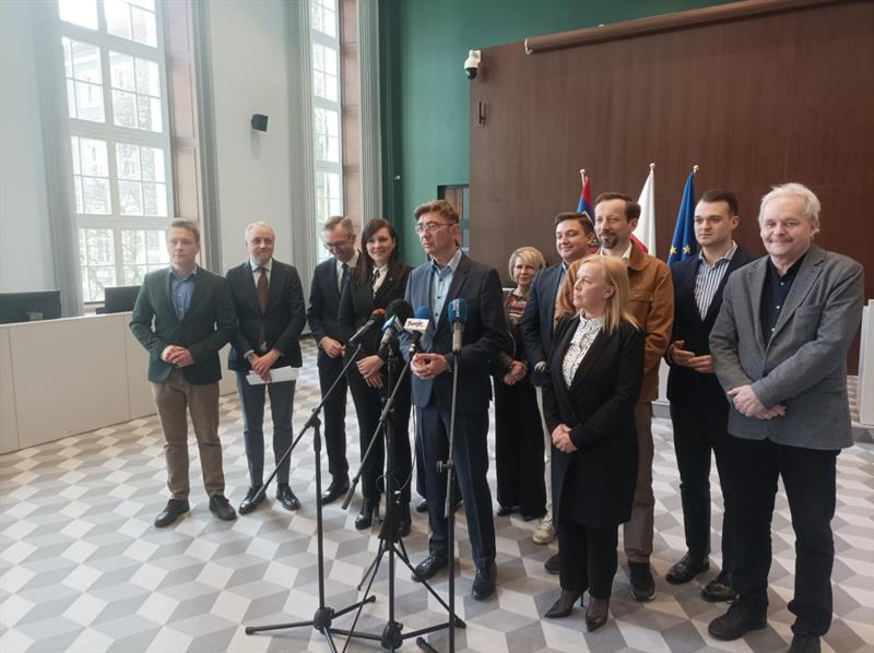 Podczas konferencji prasowej w sali sesyjnej Rady Miasta Szczecin przedstawiciele klubu KO przekonywali, że ich współpraca z prezydentem Szczecina Piotrem Krzystkiem układa się bardzo dobrze. Fot. Alan Sasinowski