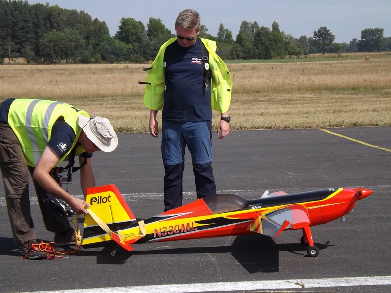 - Połączyłem trzy modele w jeden - mówi modelarz z Bydgoszczy Jerzy Rogacewicz. - Formacje w lotnictwie to nic szczególnego. W tym przypadku tylko jeden samolot, ten pierwszy ma napęd, natomiast modele boczne połączone z pierwszym rurkami z poliwęglanu, są sterującymi. Modelem bardzo łatwo się steruje po warunkiem, że nie ma zbyt silnego wiatru.