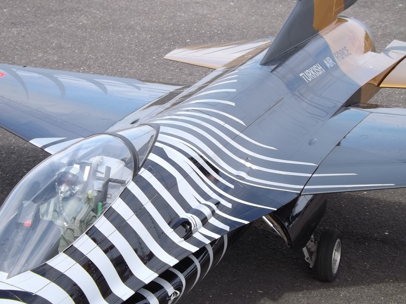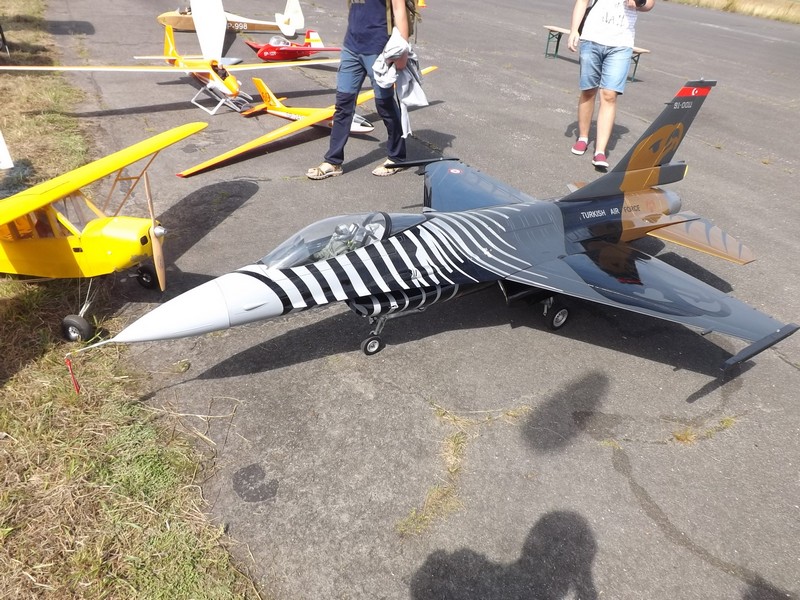 - Niech nikogo nie dziwią barwy tego samolotu - mówi Bartosz Cierzniak, modelarz z Margonina koło Piły. - Mój F 16 jest w barwach tureckich sił zbrojnych z prostego powodu. Kolega lakiernik lakierował dwa takie modele i z "rozpędu" zrobił też tego, którego możecie tu państwo podziwiać. Niewykluczone jednak, że niebawem przemaluję go w polskie barwy. W Polsce są tylko dwa tego typu modele w skali 1:5. Silnik modelu jest odrzutowy, jak w prawdziwym samolocie. Napędzany jest naftą lotniczą. Wszystkie elementy modelu są zachowane jak w oryginale, łącznie z elektroniką i podwoziem. To "cacko" waży 27 kg, ma ponad 3 m długości. Zabiera ze sobą ponad 7 litrów nafty lotniczej, co pozwala na niecały kwadrans lotu.