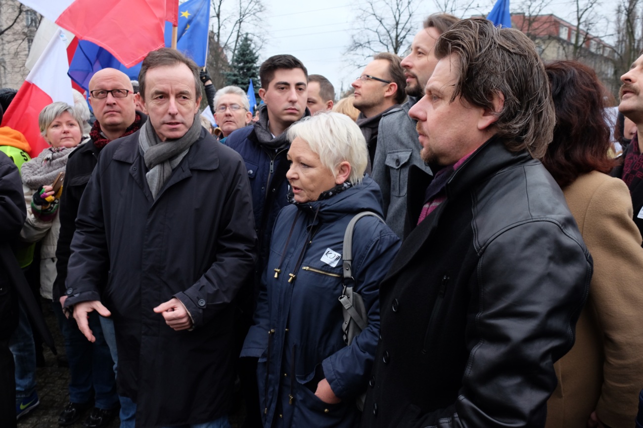 Na zdjęciu: Nowy przewodniczący Nowoczesnej - poseł Piotr Misiło - na placu Grunwaldzkim w Szczecinie podczas niedzielnej manifestacji przeciwników PiS. Po lewej stronie posłanka Magdalena Kochan i senator Tomasz Grodzki (oboje z PO).