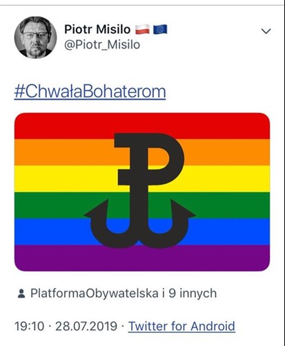 Prawdziwą burzę w mediach społecznościowych wywołał Piotr Misiło, poseł szczecińskiej Platformy Obywatelskiej, publikując na Twitterze znak Polski Walczącej na tle tęczowej flagi kojarzonej ze środowiskiem LGBT. To połączenie części użytkowników mediów społecznościowych bardzo się nie spodobało. Od inicjatywy zdystansowała się sama PO. Ostatecznie poseł zamieścił przeprosiny.