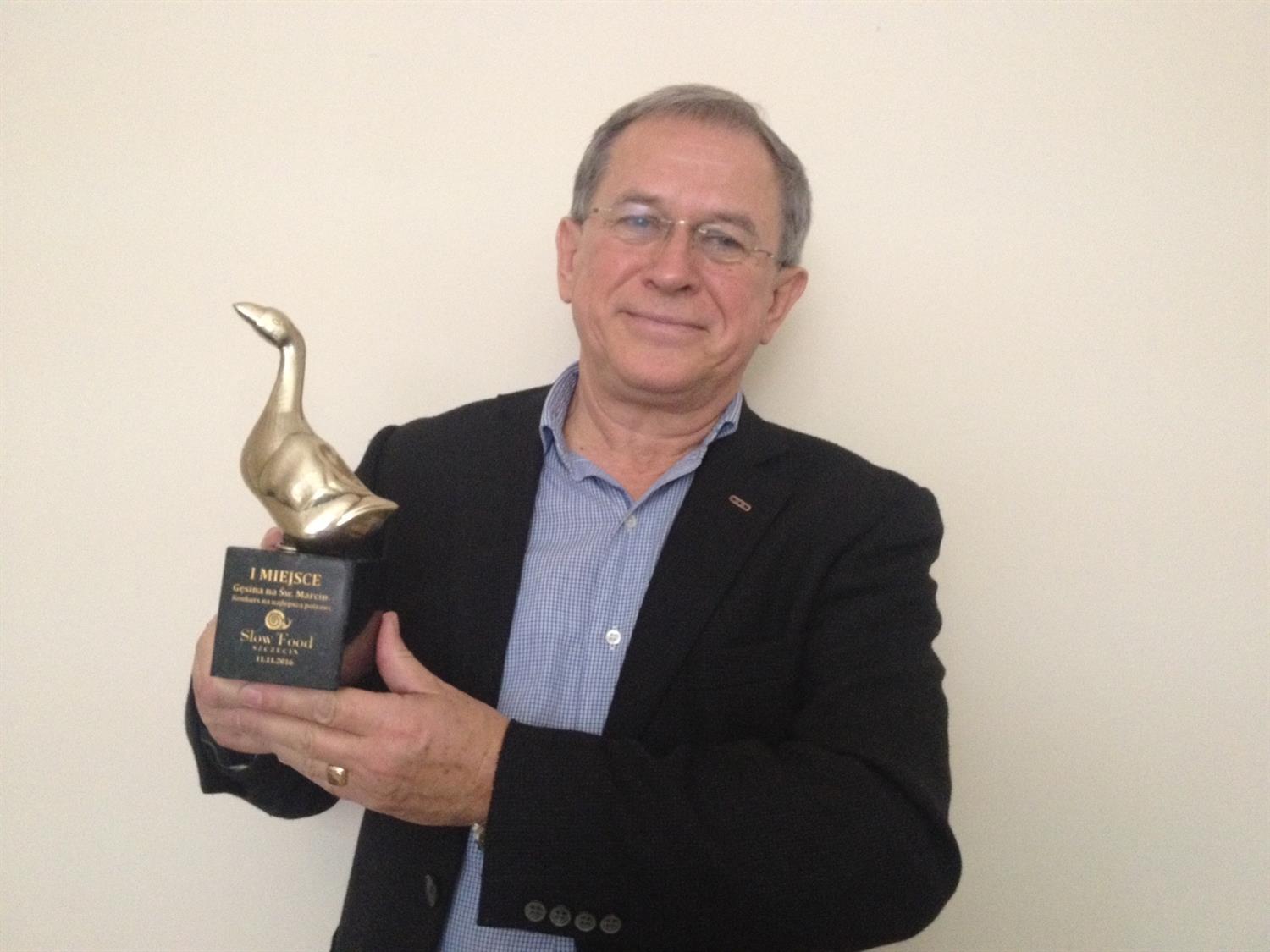 Andrzej Buławski prezentuje statuetkę, która trafi w ręce najlepszych kucharzy uczestniczących w konkursie.