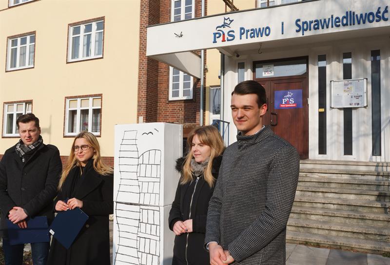 Młodzi Demokraci, czyli młodzieżówka Platformy Obywatelskiej, urządzili przed siedzibą szczecińskiego Prawa i Sprawiedliwości happening nawiązujący do "taśm Kaczyńskiego". Skrytykowali prezesa PiS-u za jego negocjacje biznesowe i postawili karton, na którym namalowali dwie wieżowce mające symbolizować obiekty, o których rozmawiał lider zjednoczonej prawicy.