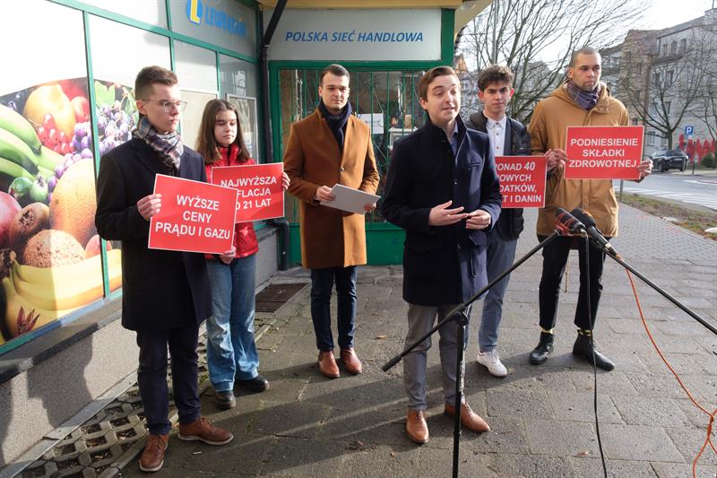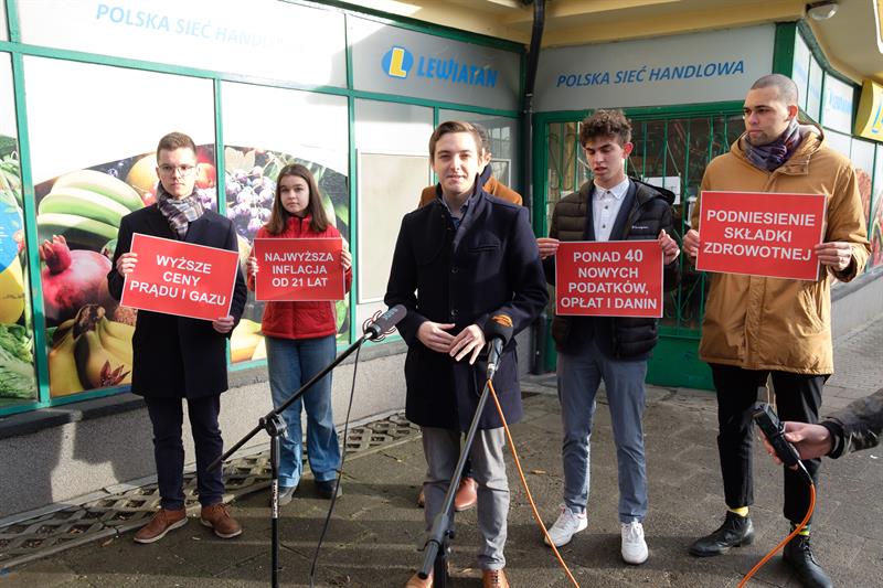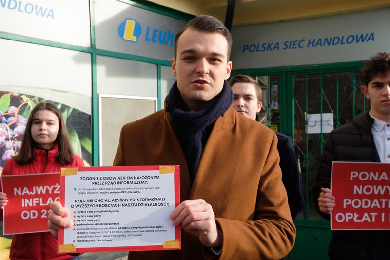- Rząd PiS wprowadził nową ustawę nakazującą przedsiębiorcom umieszczanie w swoich sklepach tabliczek informujących o tym, że w ramach gierkowskiej propagandy obniżył podatek na żywność z 5 do 0 procent - mówił Mateusz Gieryga. - Natomiast rząd nie chce powiedzieć, że jednocześnie wzrosły ceny energii, gazu, że ceny paliw rosną, że naliczył ponad 40 podatków i danin, które dotkną przedsiębiorców i nas, konsumentów. Inflacja, którą mamy, jest najwyższa od 21 lat.