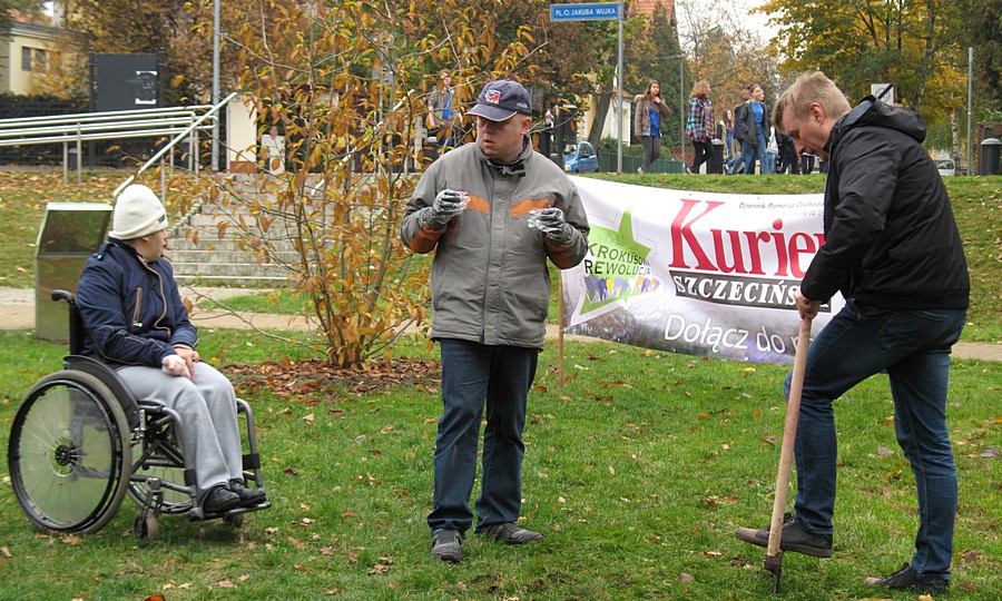 Tomasz zanim zdołał wymówić własne imię, zdążył posadzić kilkanaście kwiatowych cebul i z radości podskoczyć jak dziecko. „Wszystkie działania naszej Rady Osiedla są nastawione na społeczną integrację. Dzisiaj jednak w szczególny sposób, bo razem z osobami niepełnosprawnymi krokusami upiększamy nasz pl. Jakuba Wujka” – komentował Paweł Wierzchowiec z RO Pogodno.