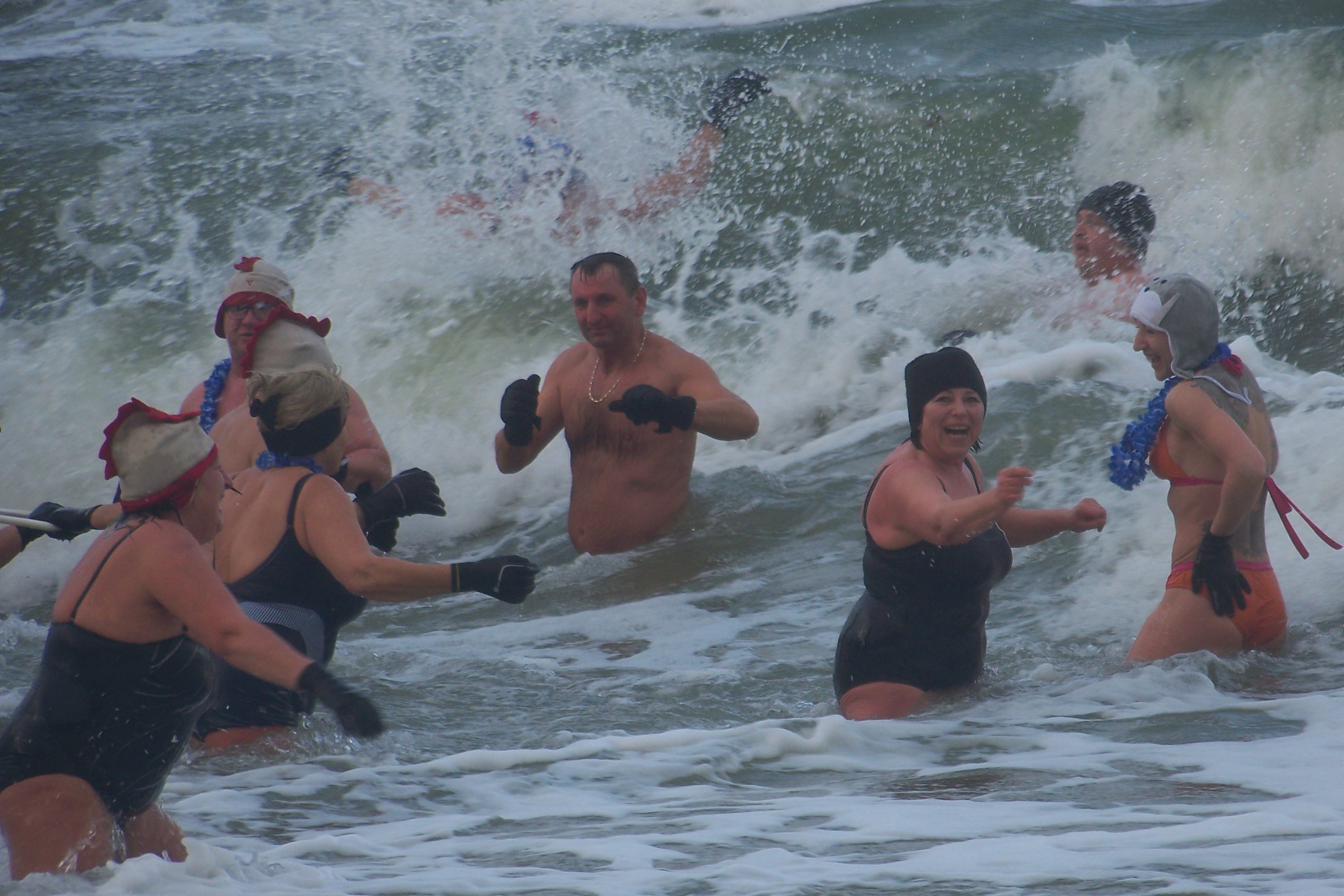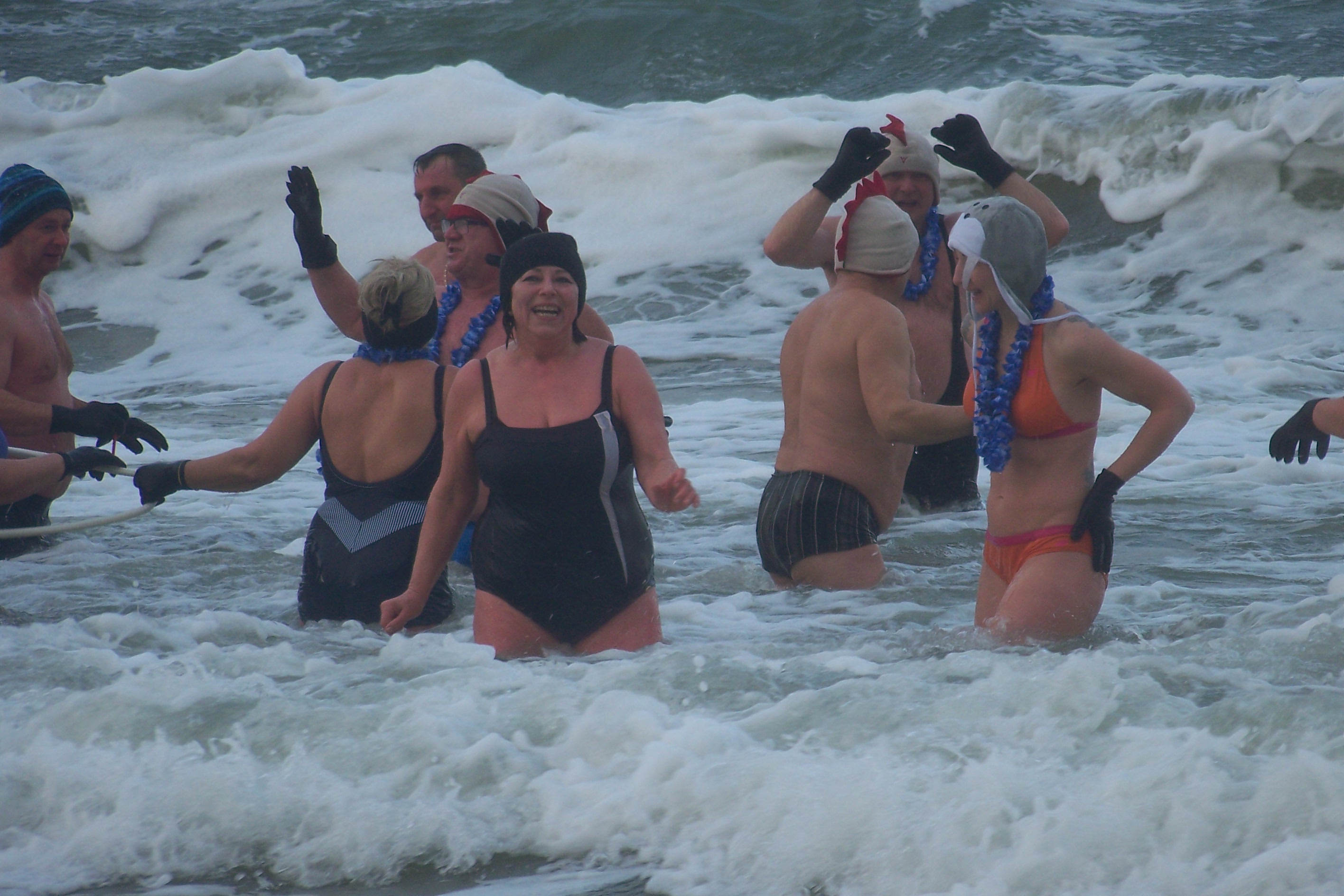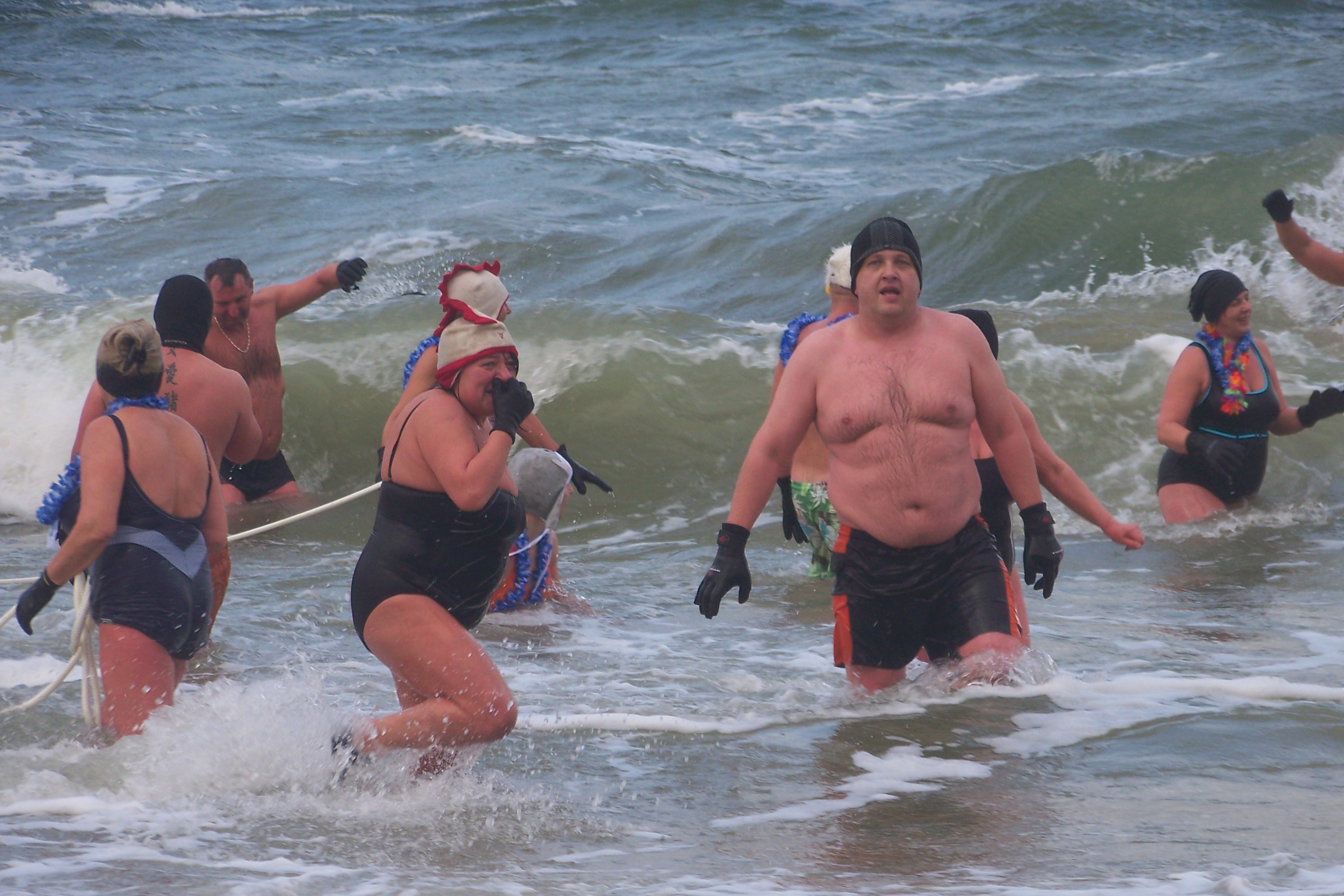 Po intensywnej rozgrzewce grupa morsów (a wśród nich kilku debiutantów) wbiegła do spienionego sztormowym wiatrem Bałtyku. Marzli jedynie widzowie dopingujący kąpiących z brzegu.