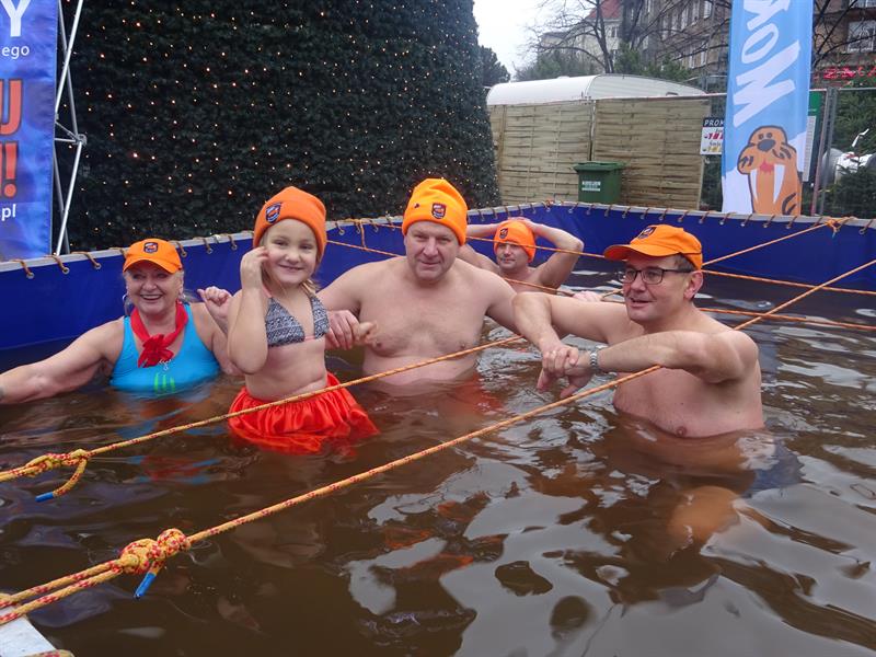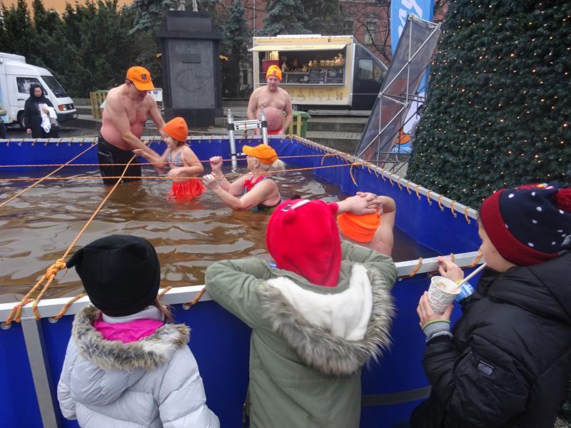 Zima nie rozpieszcza w tym roku mroźną pogodą. Jeziora są wolne od lodu, więc morsy ze Szczecina i Polic postanowiły wykąpać się w niedzielę na Jarmarku Bożonarodzeniowym na pl Lotników. Pod wielką choinką, opodal pomnika Colleoniego, w basenie z lodowatą wodą zanurzała się grupka członków Stowarzyszenia Szczecińsko-Policki Klub "MORSY" im. Zbyszka Ulatowskiego. Nie zabrakło prezesa Ireneusza Kowieskiego. Był też najmłodszy mors - Nicola. Co prawda amatorzy zimnych ablucji mieli nadzieję, że na taką formę hartowania organizmu skuszą się także mieszkańcy Szczecina, ale ci być może nie dopisali z powodu... deszczu. Tak czy inaczej klub zaprasza również na bożonarodzeniowe świąteczne kąpiele morsowe nad Jezioro Głębokie: wtorek (25 grudnia) o godz 13 i w środę (26 grudnia) o godz. 13 oraz huczną kąpiel noworoczną we wtorek (1 stycznia 2019r.) o godz. 13.