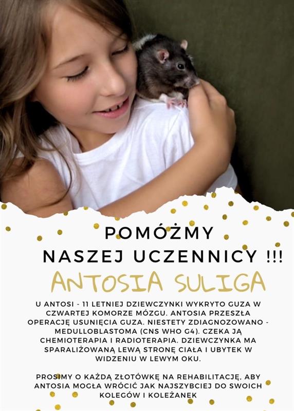 U 11-letniej Antoniny Suligi zdiagnozowano we wrześniu br. złośliwego guza mózgu. Dziewczynka przeszła już operację na Oddziale Neurochirurgii Dla Dzieci i Dorosłych w Szczecinie-Zdrojach, wciąż jednak potrzebna jest pomoc finansowa na rehabilitację. Z pomocą ruszyli uczniowie i nauczyciele z jej szkoły.