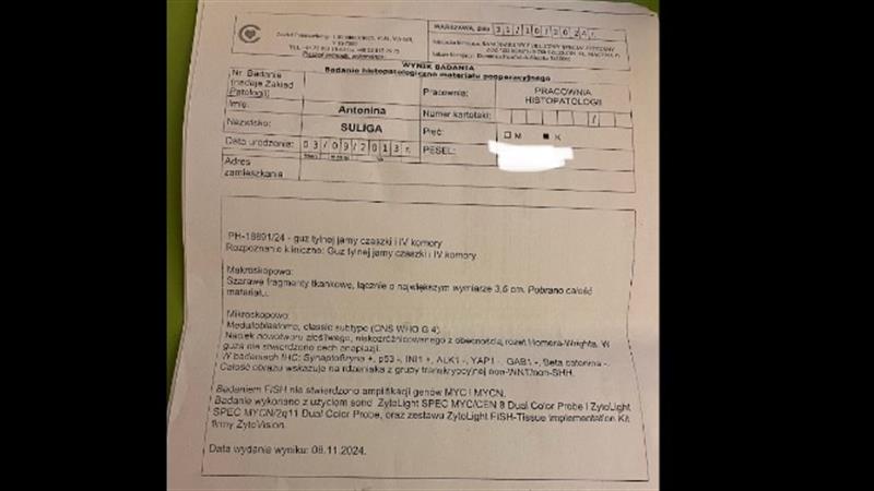 - We wrześniu nasza córka zaczęła się skarżyć na bóle głowy, wymioty. Ból nasilał się w nocy. Lekarz zdiagnozował zapalenie zatok, ale dał też skierowanie do neurologa. Gdy brała leki, ból głowy był mniej dokuczliwy, myśleliśmy, że to faktycznie zapalenie zatok. Po zakończeniu leczenia, córka zaczęła się skarżyć, że słabo widzi na lewe oko. Zauważyliśmy, że lewe oczko „ucieka”. Natychmiast umówiliśmy Antosię do okulisty w Szczecinie. Już w trakcie badania, po minie pani doktor, zauważyliśmy, że jest coś nie tak – mówią rodzice Katarzyna Machalska i Paweł Suliga.
