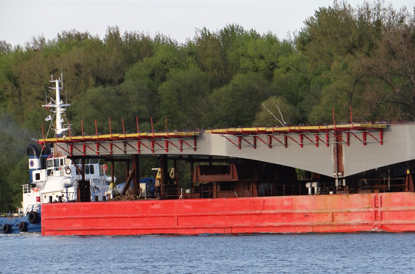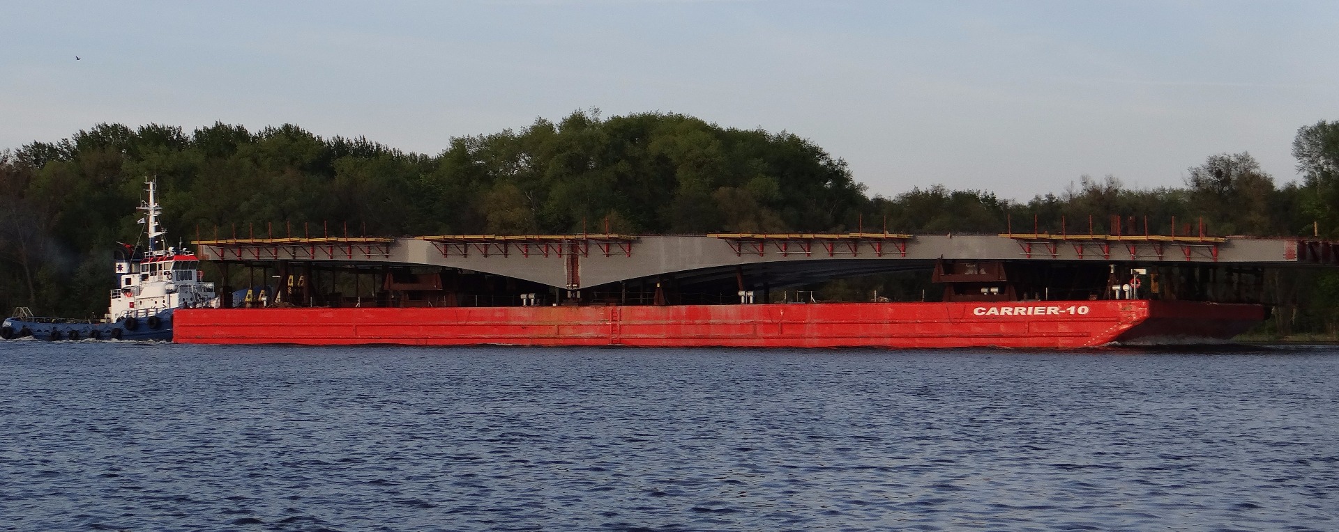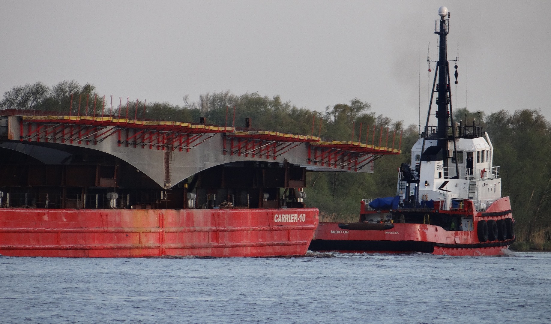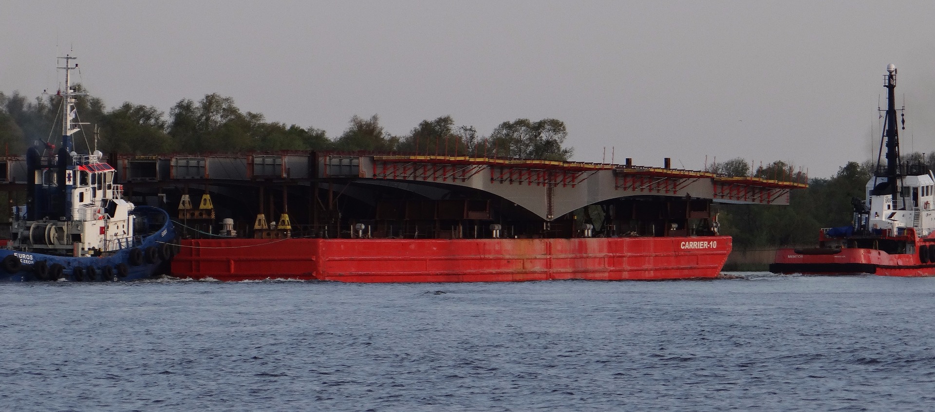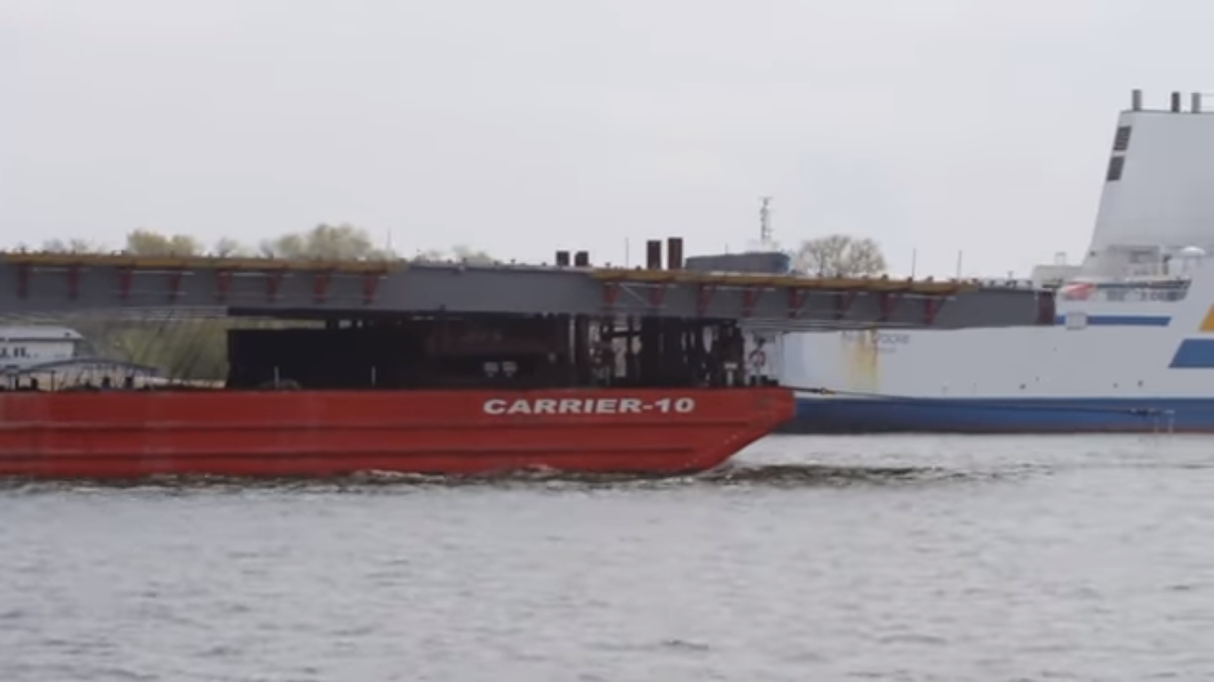 W czwartkowe popołudnie - po morskiej części podróży - najpierw do Świnoujścia dotarły na pontonie Carrier-10 segmenty stalowej konstrukcji nowego mostu Cłowego, który stanie nad Regalicą w Szczecinie. A od wieczora cumuje ona przy nabrzeżu w odległości 500 m od miejsca nad rzeką, gdzie powstaje nowa przeprawa.