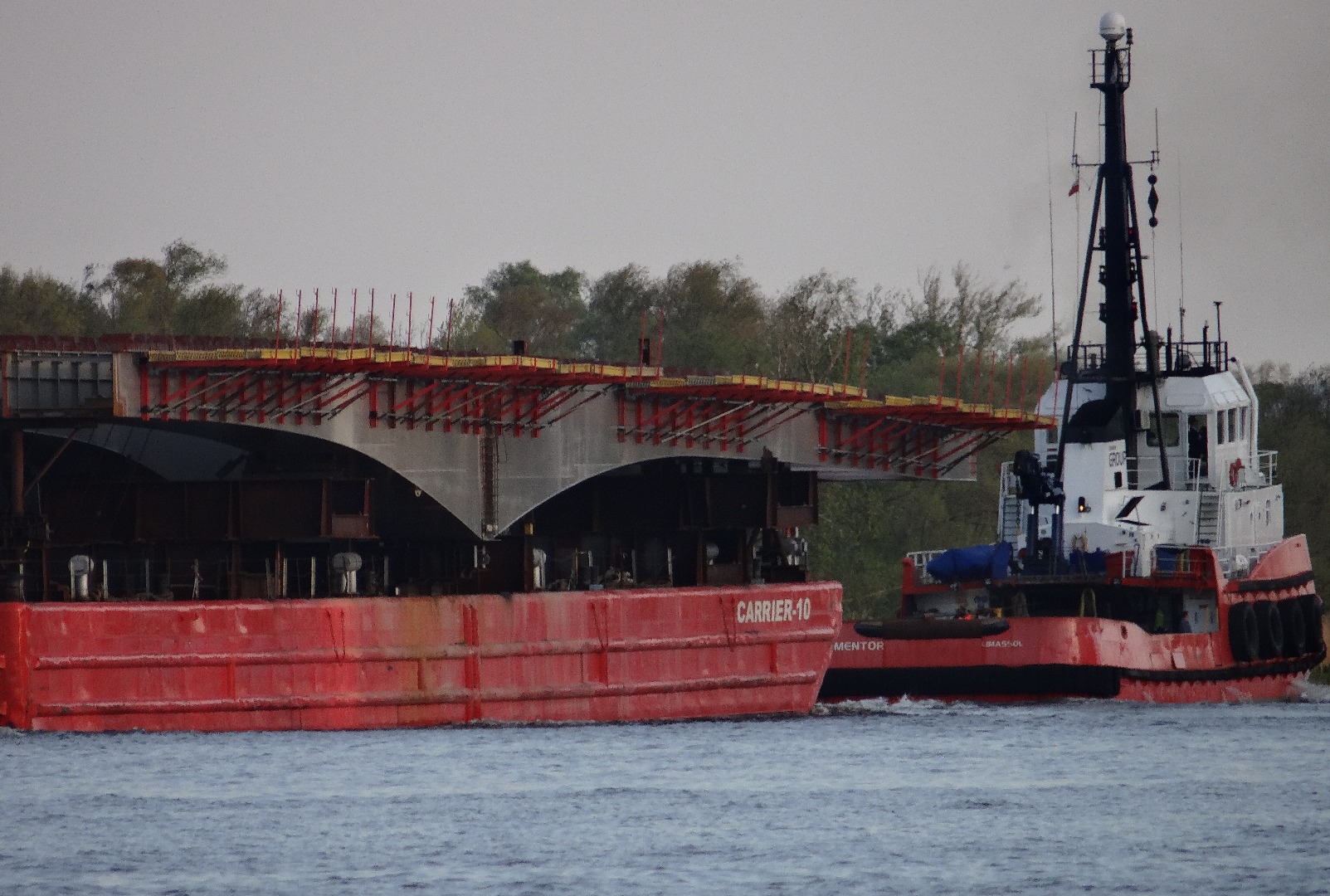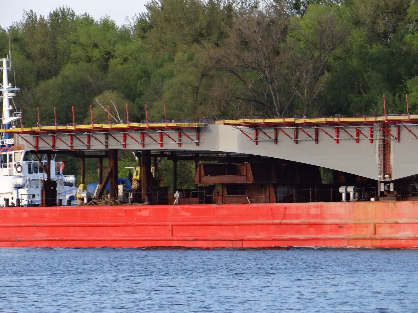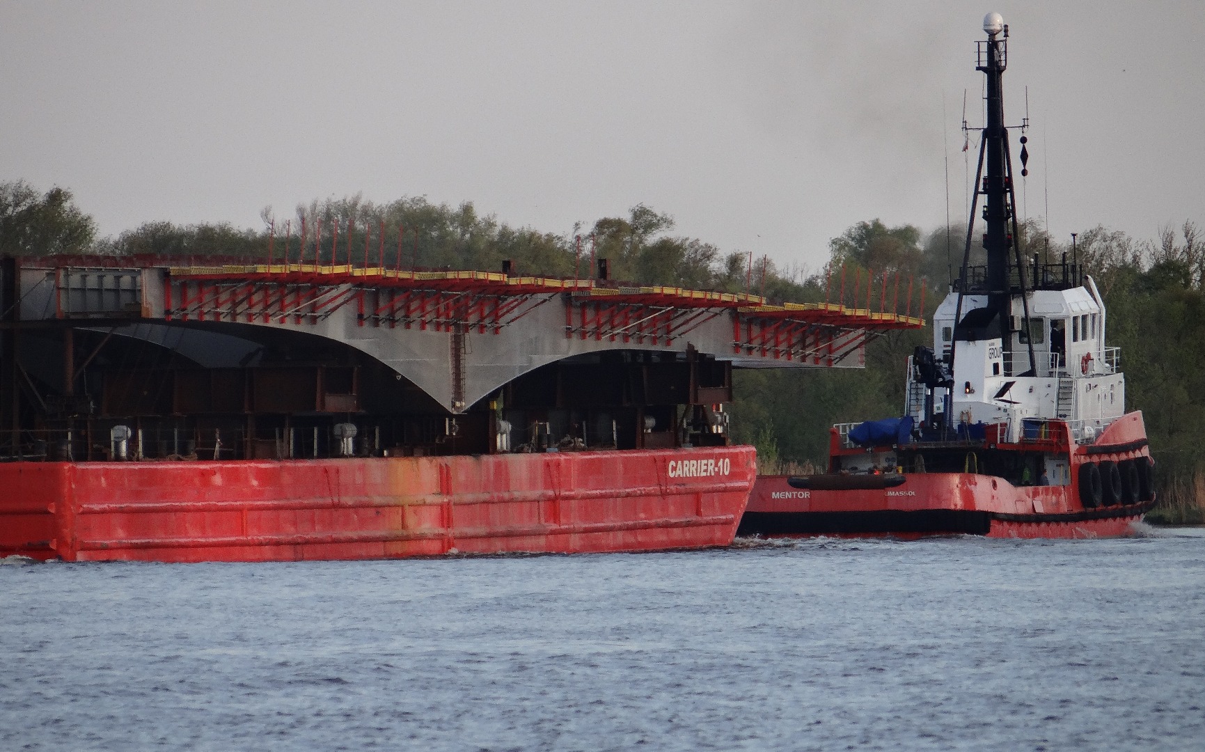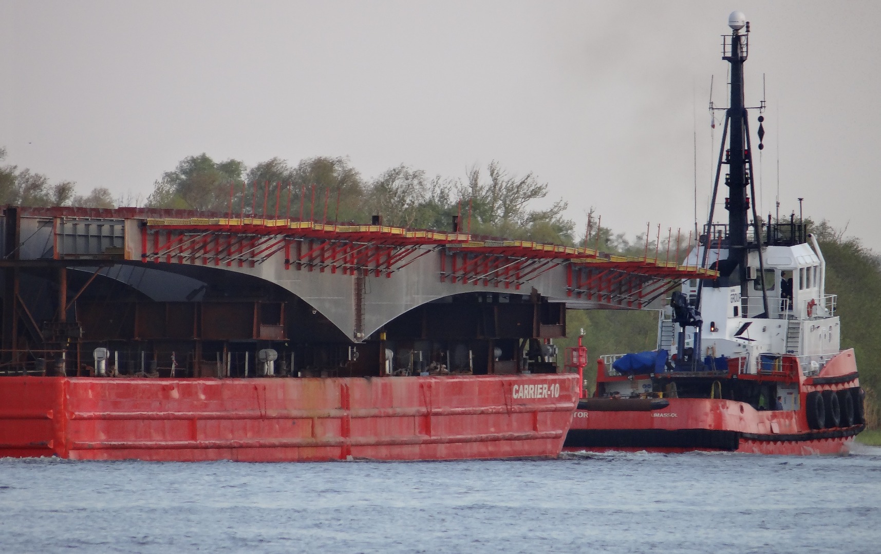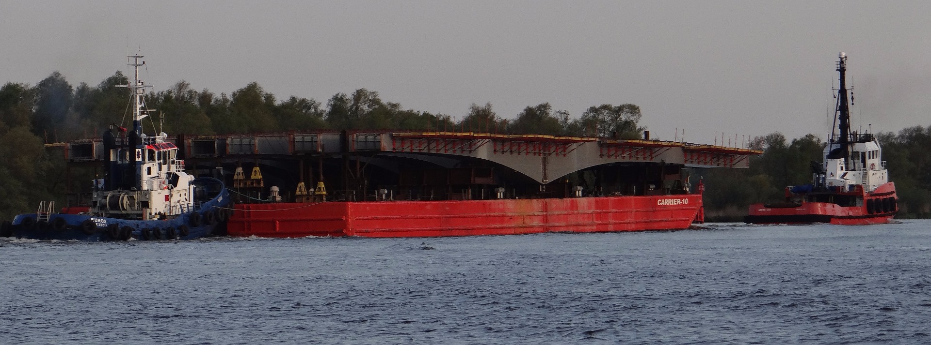 W czwartkowe popołudnie - po morskiej części podróży - najpierw do Świnoujścia dotarły na pontonie Carrier-10 segmenty stalowej konstrukcji nowego mostu Cłowego, który stanie nad Regalicą w Szczecinie. A od wieczora cumuje ona przy nabrzeżu w odległości 500 m od miejsca nad rzeką, gdzie powstaje nowa przeprawa.