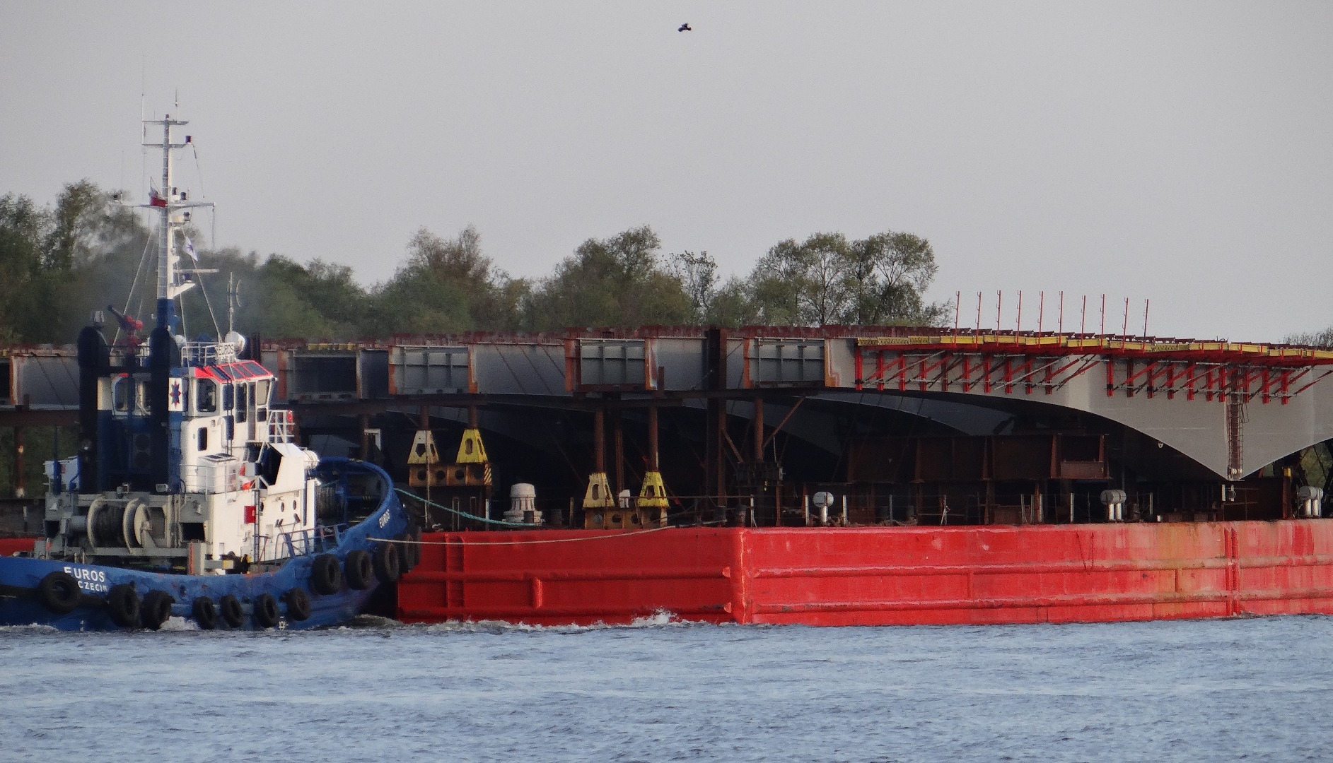 Nad Regalicę holowniki Mentor i Euros dotarły z transportem kilka minut przed godz.21. Przęsła nowej konstrukcji mostu czekają teraz na montaż przy brzegu na wysokości Dąbskiej Strugi.