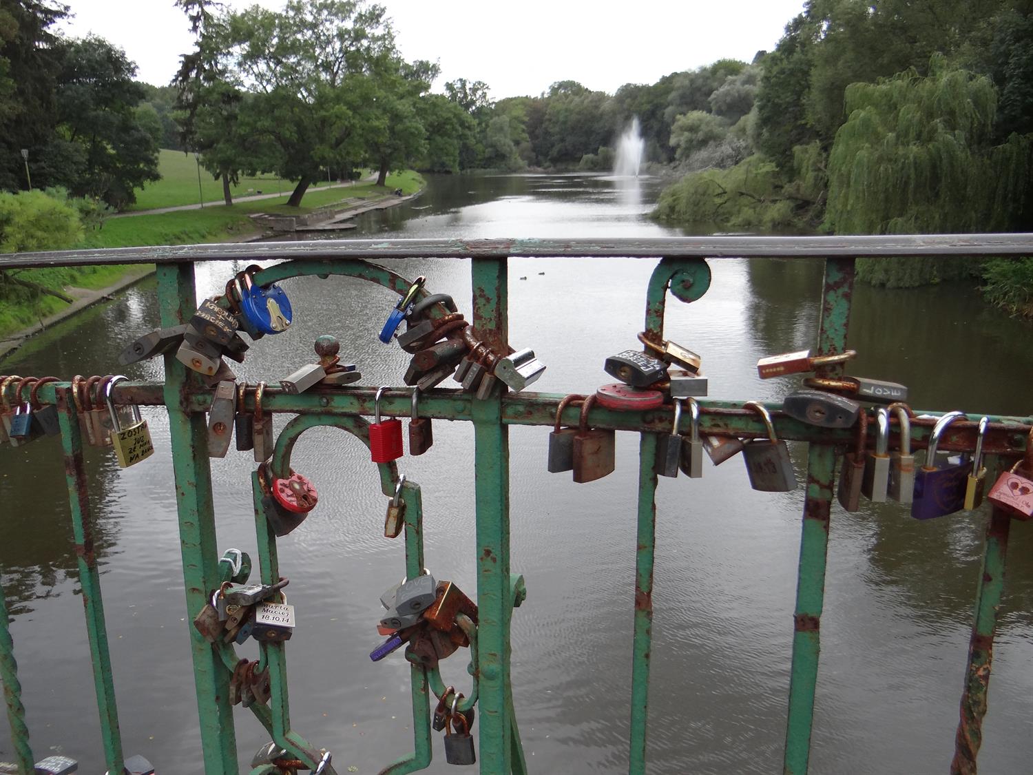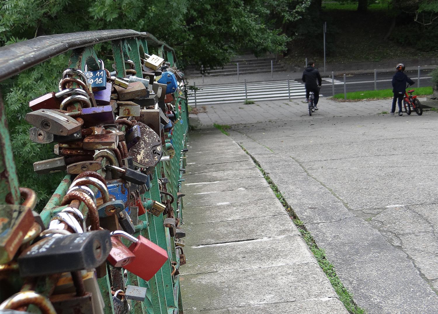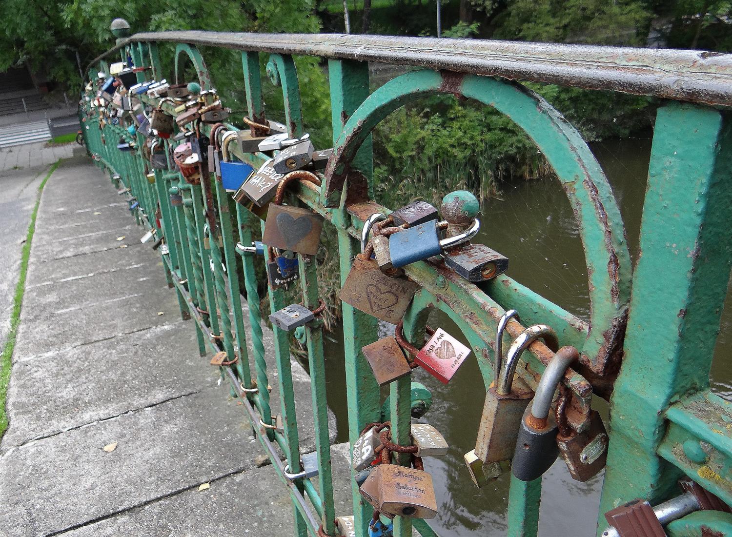 Co to za debilny zwyczaj wieszać kłódki, które rdzewieją! To samo widziałem we Wrocławiu - Most Tumski. Jak to wygląda, koszmar. Obiekt jest wpisanym do rejestru zabytków. Dlaczego w związku z tym pozwala się, żeby był dewastowany i oszpecany przez "zakochanych złomiarzy".
