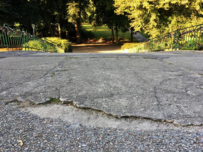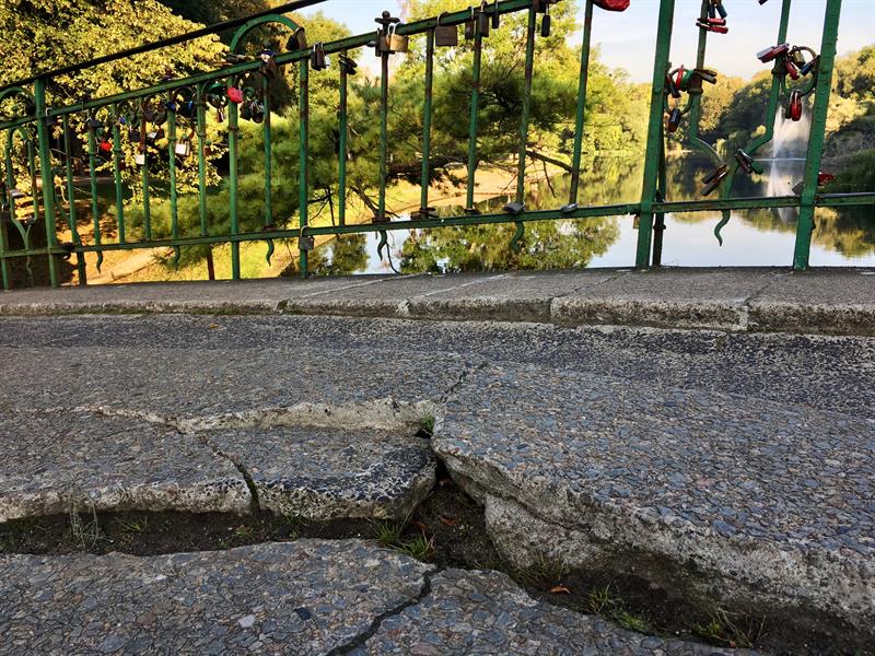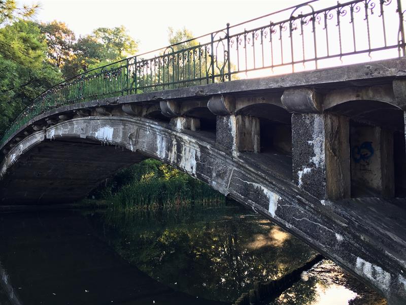 To już ruina. Ubytki w betonowej konstrukcji łukowego - zwanego też japońskim lub miłości - mostku od lat były coraz bardziej widoczne. Pojawiały się kolejne niepokojące pęknięcia, odsłaniające stalowe elementy budowli. I coraz większe wykwity, świadczące nawet o korozji betonu. Przy przyczółkach co pewien czas się otwierały zapadliska, budząc wątpliwość nawet co do stabilności umocowania całego obiektu. I obawy, że mostek w każdej chwili może się zawalić.