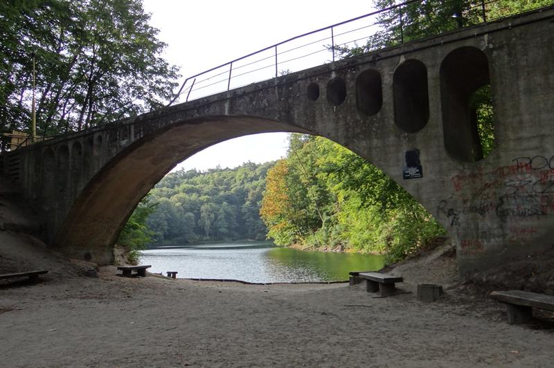 Charakterystyczny mostek nad Jez. Szmaragdowym - jak i ono samo - to pozostałość po istniejącej w tym miejscu kopalni kredy, eksploatowanej na rzecz pobliskiej cementowni „Stern" (1880 r.). Samo jezioro to efekt katastrofy - w lipcu 1925 r. wyrobisko zostało zalane wodą, która runęła nań z południowej ściany. Stąd na jego dnie wciąż tkwią pozostałości górniczych maszyn i urządzeń. Natomiast charakterystyczny mostek nad taflą wody - jeden z najlepszych punktów widokowych tej części Szczecińskiego Parku Krajobrazowego „Puszcza Bukowa” - to tak naprawdę betonowy wiadukt kolejki kopalnianej, którą wywożono urobek kredy do cementowni.