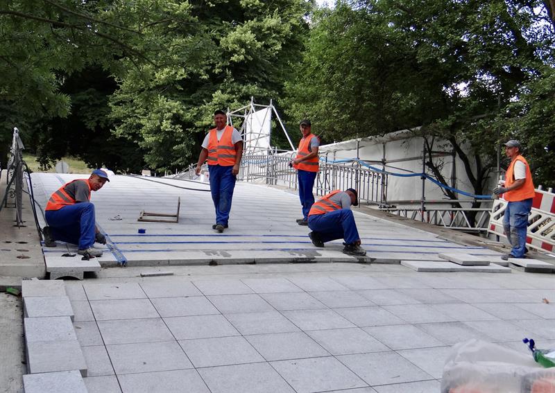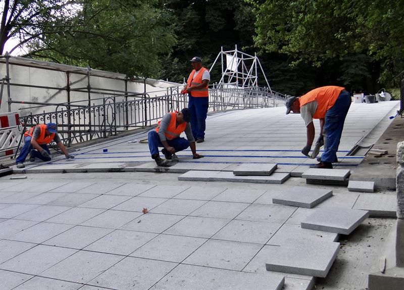 Na początku sierpnia na moście rozpoczęło się układane płyt granitowych nowej nawierzchni wraz z elementami odprowadzania deszczówki. Montowane są po obu stronach podłużne odpływy z kamienia. W minionych tygodniach renowacji i zabezpieczeniu poddane zostały też cokoły na obu przyczółkach.