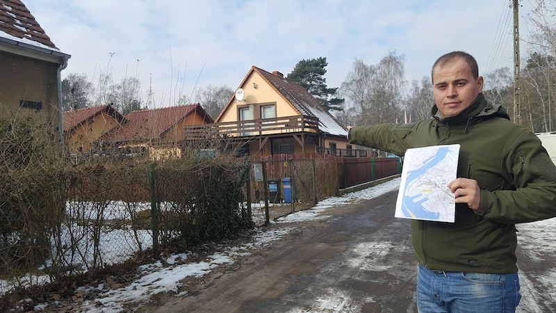 Na zdjęciu: Dariusz Krzywda pokazuje budynek przeznaczony do wyburzenia. W jego sąsiedztwie ma przebiegać wał ziemny, który podzieli Warszów.