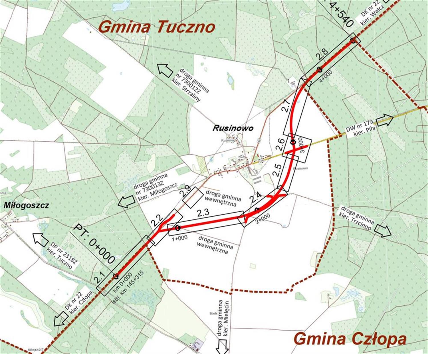 – Nowy przebieg DK22 ominie Rusinowo od wschodu – przybliża inwestycję M. Grzeszczuk. – Będzie to jednojezdniowa droga klasy GP (główna ruchu przyspieszonego). W ramach inwestycji zostanie wybudowany wiadukt nad drogą gminną oraz przepust dla małych zwierząt. Powstanie również system odwodnienia drogi z trzema zbiornikami retencyjno-infiltracyjnymi. Wzdłuż obwodnicy, od jej początku od strony Wałcza do ronda z DW179, zaplanowaliśmy budowę ścieżki pieszo-rowerowej, która będzie kontynuacją ścieżki wzdłuż DK22 przewidzianej do realizacji w ramach przebudowy tej drogi krajowej.