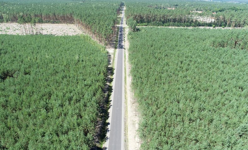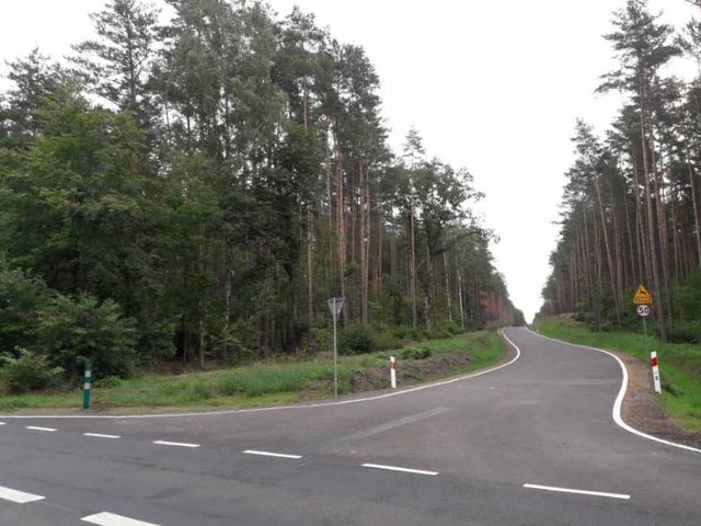 wycięto pas lasu o szerokości 18m,a jezdnia ma 6m.