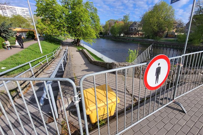 Mowa o chodniku przylegającym do murów oporowych Parsęty. Powodem ustawienia barierek z zakazem ruchu pieszych jest zły stan techniczny wspomnianych murów, co grozi nagłym zapadnięciem się nabrzeża. Początkowo sądzono, że za uszkodzenie odpowiadają korzenie rosnącego tam drzewa. Niedawno pojawiła się teza mówiąca o tym, że winę ponosi sama Parsęta, której nurt przez lata podmywał konstrukcję. Postanowiono, że od strony wody w miejscu uszkodzenia zostanie postawiona szczelna ścianka. Ma to pozwolić na szczegółową ekspertyzę i naprawę starego muru. ©℗