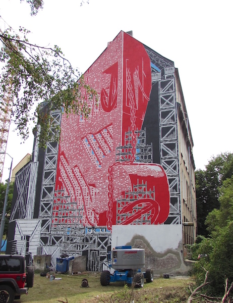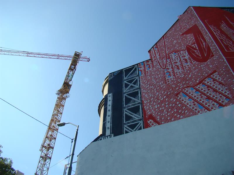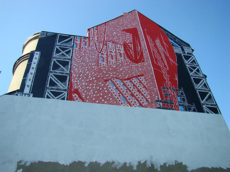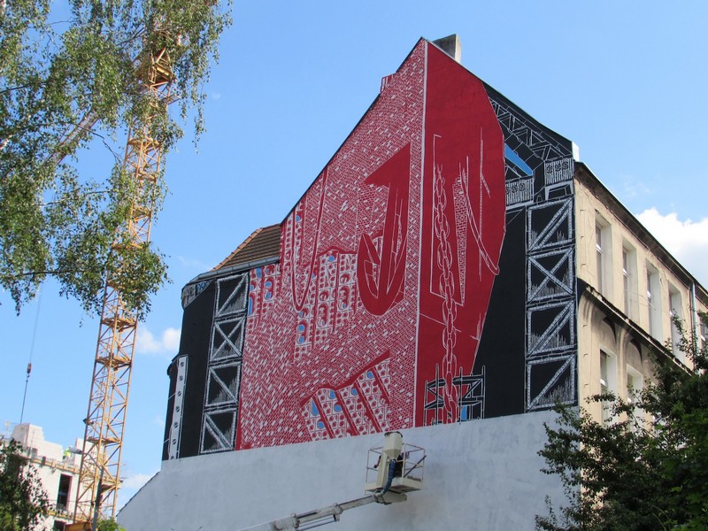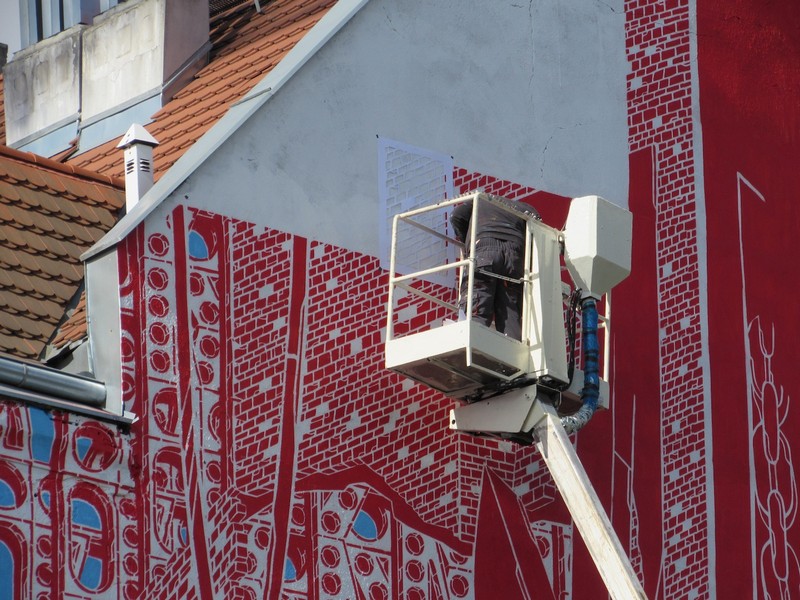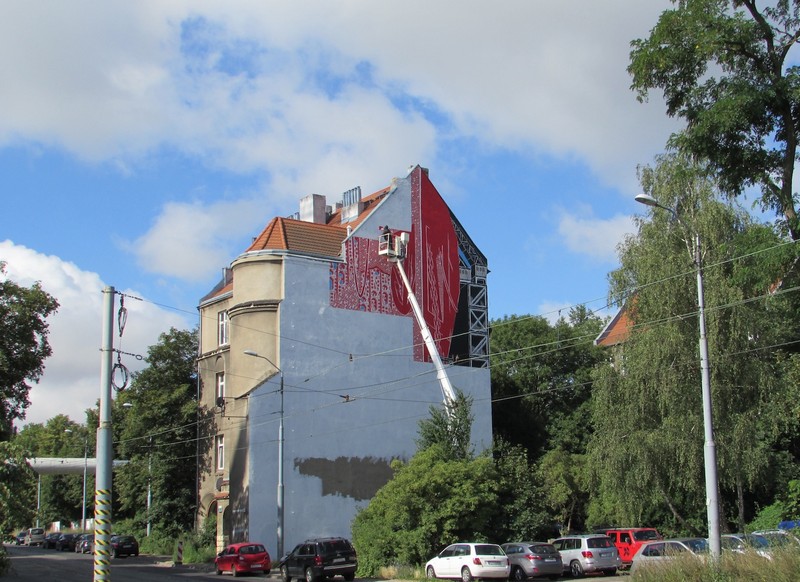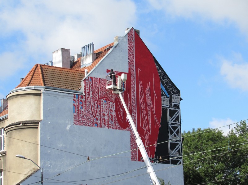 Mural na kamienicy przy ul. Chmielewskiego 8 powstaje w ramach miejskiego programu „Niwelacja błędów infrastrukturalnych poprzez sztukę ulicy – Street Art”.