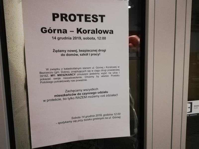 "W związku z katastrofalnym stanem ul. Górnej i Koralowej, znajdujących się w siągu drogi powiatowej 3916Z, MY MIESZKAŃCY zmuszeni jesteśmy wyjść na ulicę i pokazać swoje niezadowolenie. Chcemy by władze Powiatu Polickiego potraktowały nas poważnie" - napisali inicjatorzy pikiety.