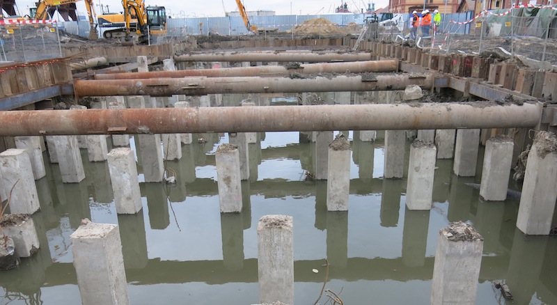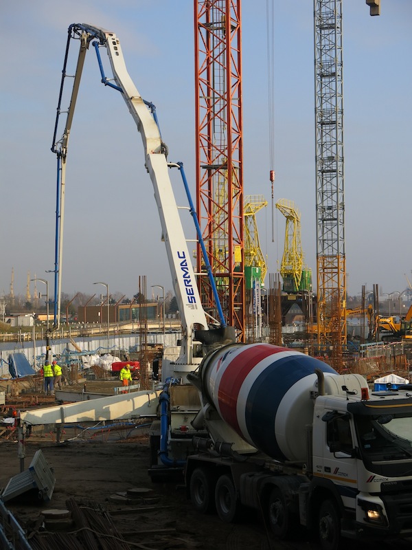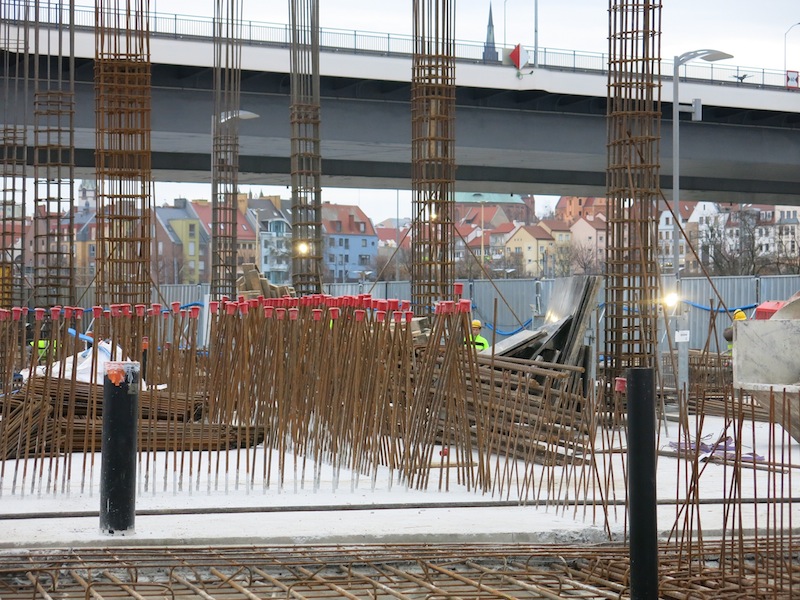 Na plac podjeżdżają kolejne ciężarówki – „gruszki”, z których pompuje się beton i rozprowadza przy pomocy specjalistycznego wysięgnika. Nad ogrodzeniem widać już elementy stalowego zbrojenia. Warunki pogodowe nie utrudniają na razie tempa prac. Wszystko idzie zgodnie z harmonogramem budowy.