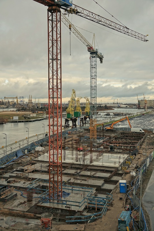 Na budowie Morskiego Centrum Nauki w Szczecinie praca wre. Ekipy generalnego wykonawcy - firmy ERBUD S.A. wykorzystują łagodną zimę i kontynuują betonowanie płyty fundamentowej.