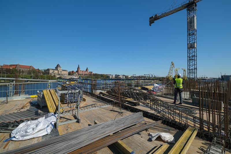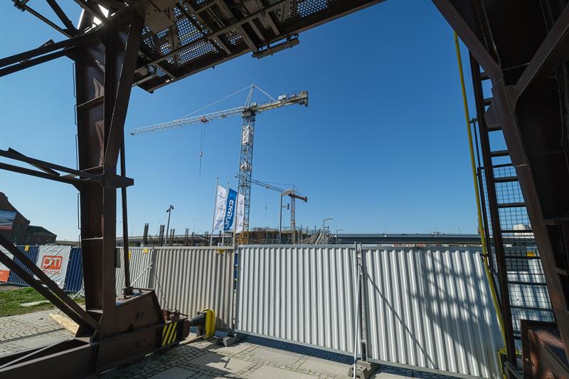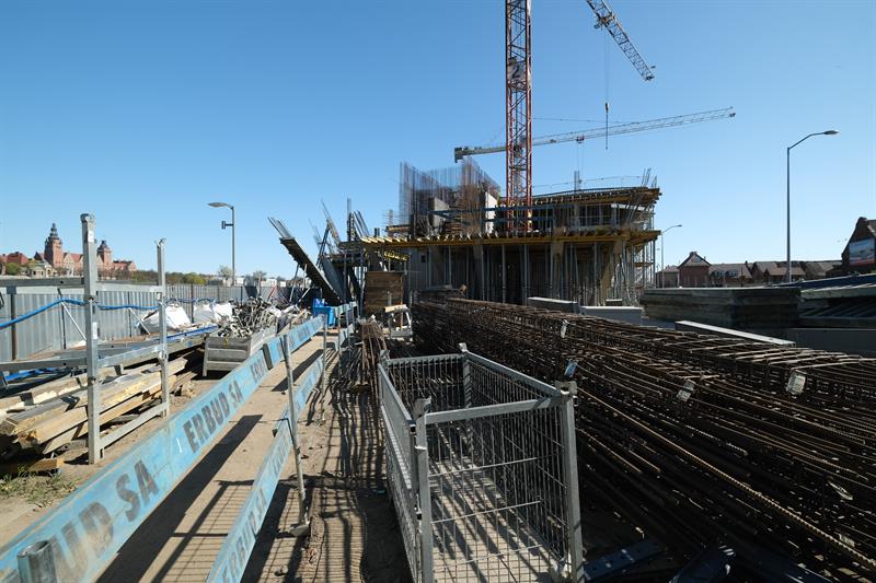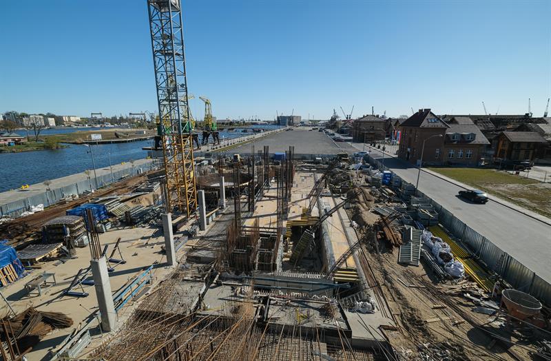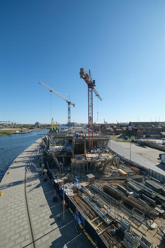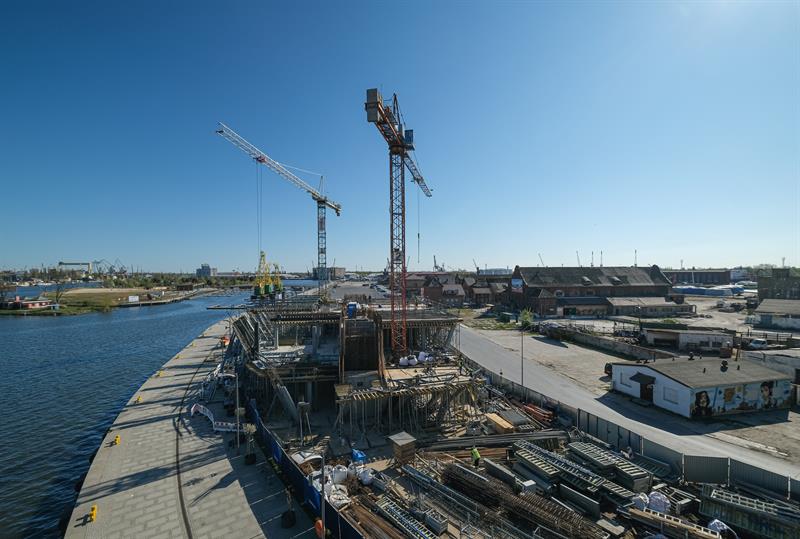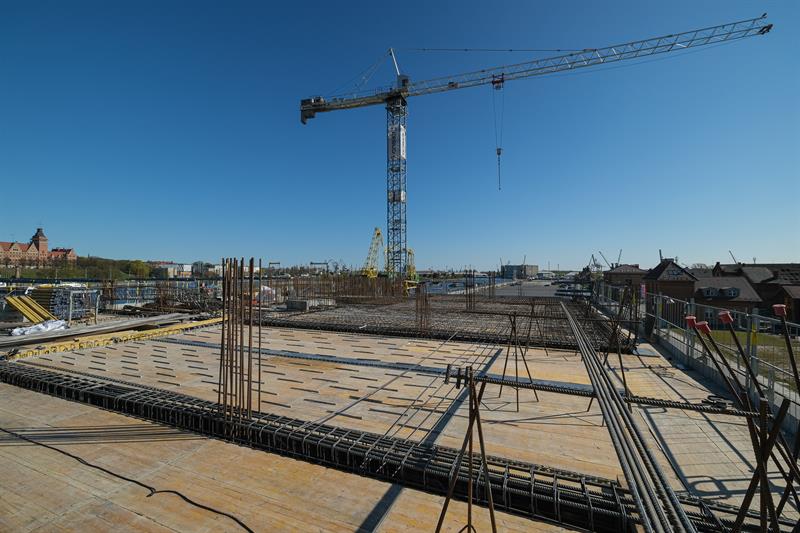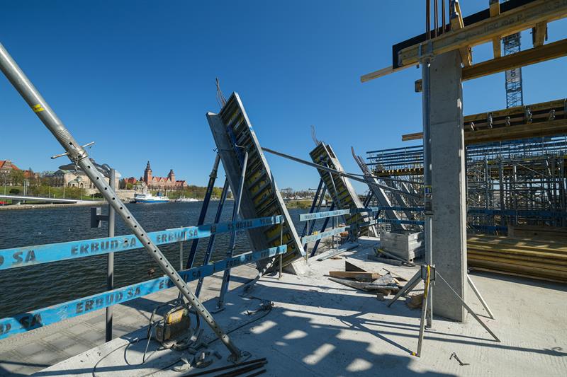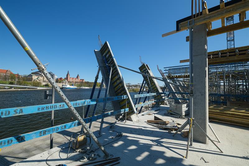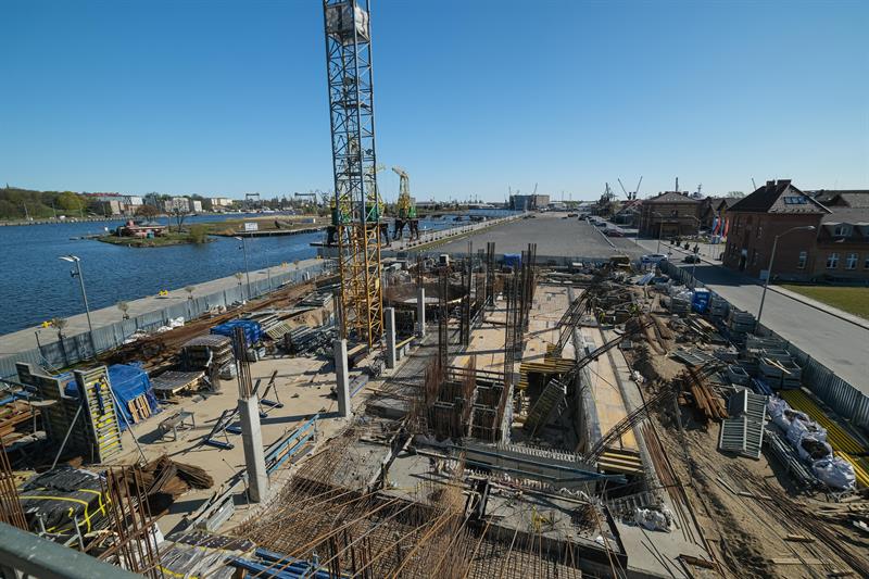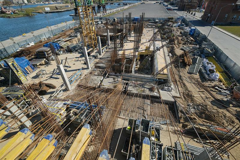 Wykonawca od kilku dni wykonuje prace związane z montażem szalunków słupów skośnych, które wymagają dostępu do placu budowy od strony nabrzeża. Przypomnijmy, że spółka ERBUD ograniczyła do 50 liczbę pracowników zaangażowanych przy inwestycji.